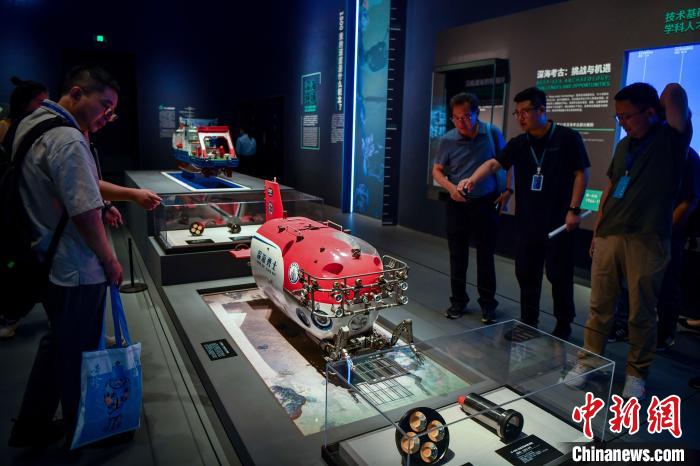 9月27日,海南琼海,展出的“深海勇士”号载人潜水器模型吸引参观者。当日,“深蓝宝藏——南海西北陆坡一二号沉船考古成果特展”在中国(海南)南海博物馆开展。本次展览是南海海域深海考古调查的成果专题展。在深海1500多米处沉睡了500多年的出水文物首次公开亮相。展览展出上述两处明代中期沉船遗址出水的文物408件(套),还有故宫博物院等借展文物34件/套,共计展出442件(套)。中新社记者 骆云飞 摄