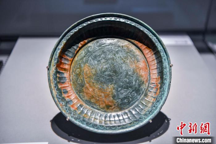 9月27日,海南琼海,展出的明代《缠枝莲纹铜盘》。当日,“深蓝宝藏——南海西北陆坡一二号沉船考古成果特展”在中国(海南)南海博物馆开展。本次展览是南海海域深海考古调查的成果专题展。在深海1500多米处沉睡了500多年的出水文物首次公开亮相。展览展出上述两处明代中期沉船遗址出水的文物408件(套),还有故宫博物院等借展文物34件/套,共计展出442件(套)。中新社记者 骆云飞 摄