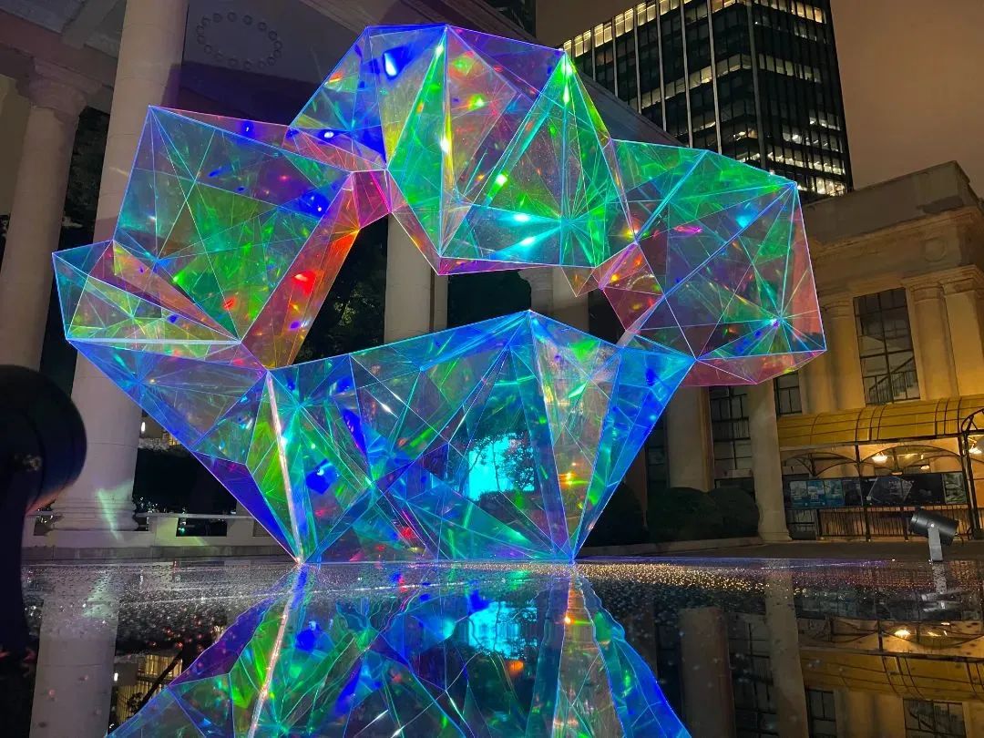 装置作品《璀璨之城》是为长宁量身定制的,放置在上生·新所二期,作品外形像是长宁城区版图的“大号钻石”,由中法艺术家联合创作,白天呈现自然光芒,夜间呈现出光影交错的璀璨效果。作品期望通过“碳”与“钻石”的理念,呼吁大家关注生态保护和可持续发展理念,并做出积极行动。