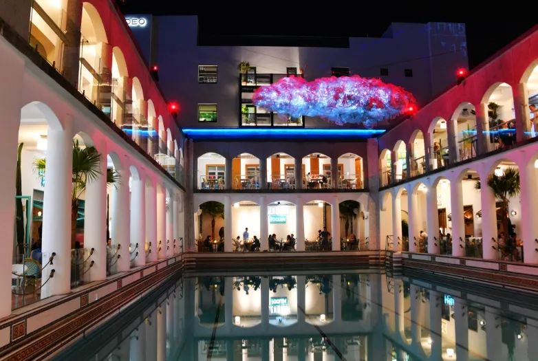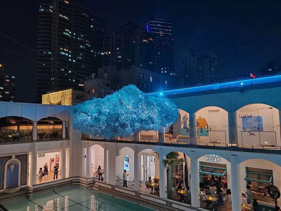 泳池上方的光影装置“上生幻境”是本次光影节最出片的点位。作品采用轻质金属纱幔这种新型的投影介质,白天看起来就像一朵云,夜间灯光亮起,纱幔上映射出点点星光,星光聚在一起,还会变幻成红色、绿色、蓝色、紫色,远远望去就像遥远星空的一片璀璨星云。此外,市民从不同角度看到的装置效果也是不同的,市民打卡时可切换不同视角,一楼二楼各有不同风景。