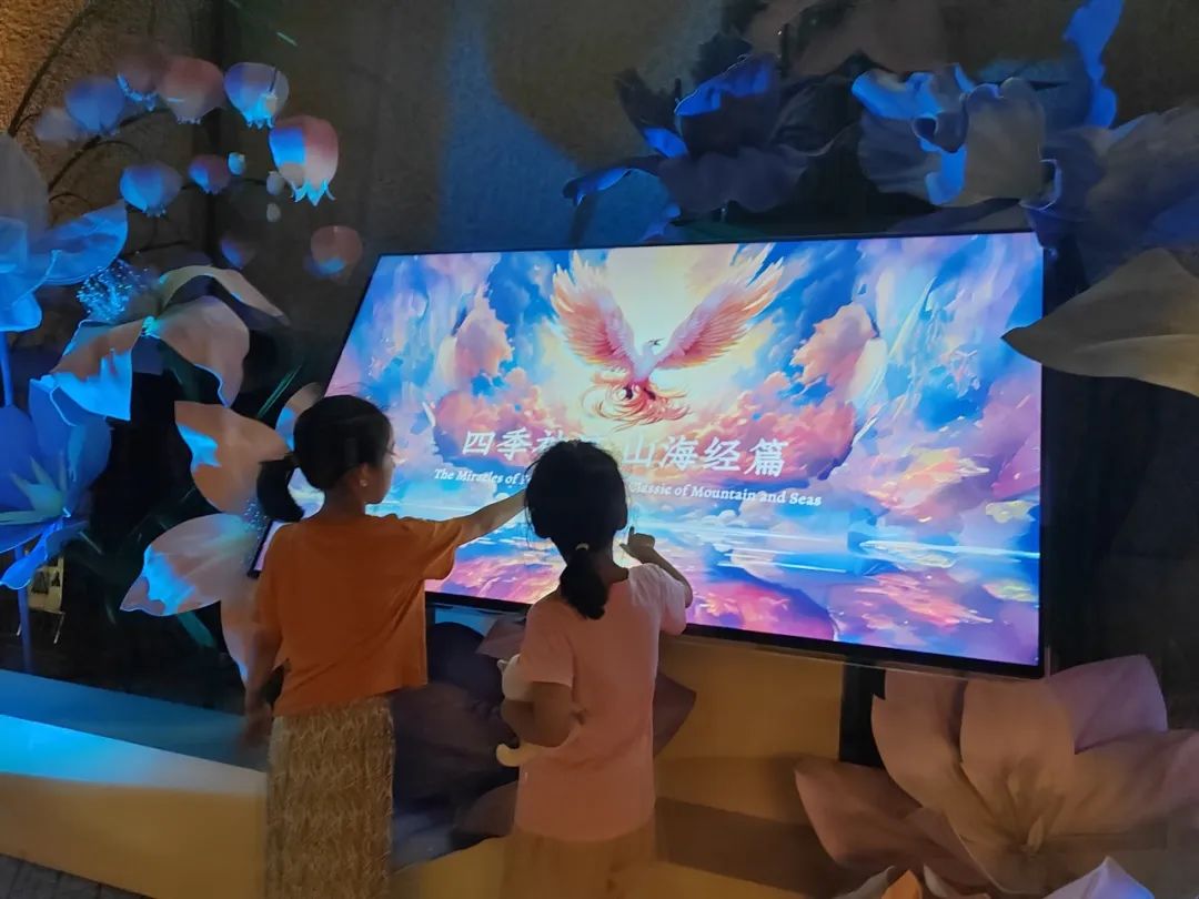 茑屋书店的《魔术奇书》是光影节专门为孩子打造且最具互动性的一个光影装置。“哇,好厉害。”看到这个装置的孩子们简直挪不动脚。作品以《四季神迹:山海经篇》为主线,孩子们通过翻书的动作,可以看到雪、海、花、雨、山等各种精灵的形象,开启一段奇妙的旅程。