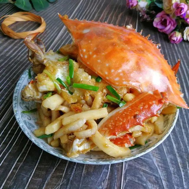 另起锅,热油爆香葱段姜片,将白蟹与年糕一并入锅翻炒。等它们于锅内一番耳鬓厮磨之后,淋入料酒,并用老抽上色、生抽调味,撒少许白糖提鲜,顺带倒一点点的水,盖上盖,烹至水稍稍收干,年糕软了,牢牢吸附了蟹的汤汁,变得浓油赤酱时,撒葱段出锅。