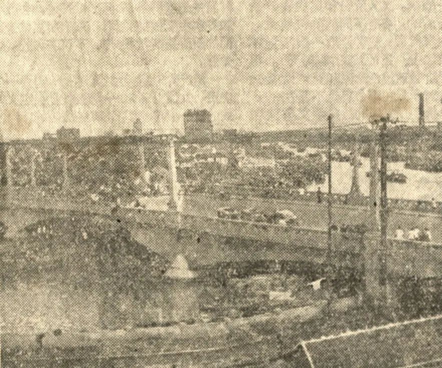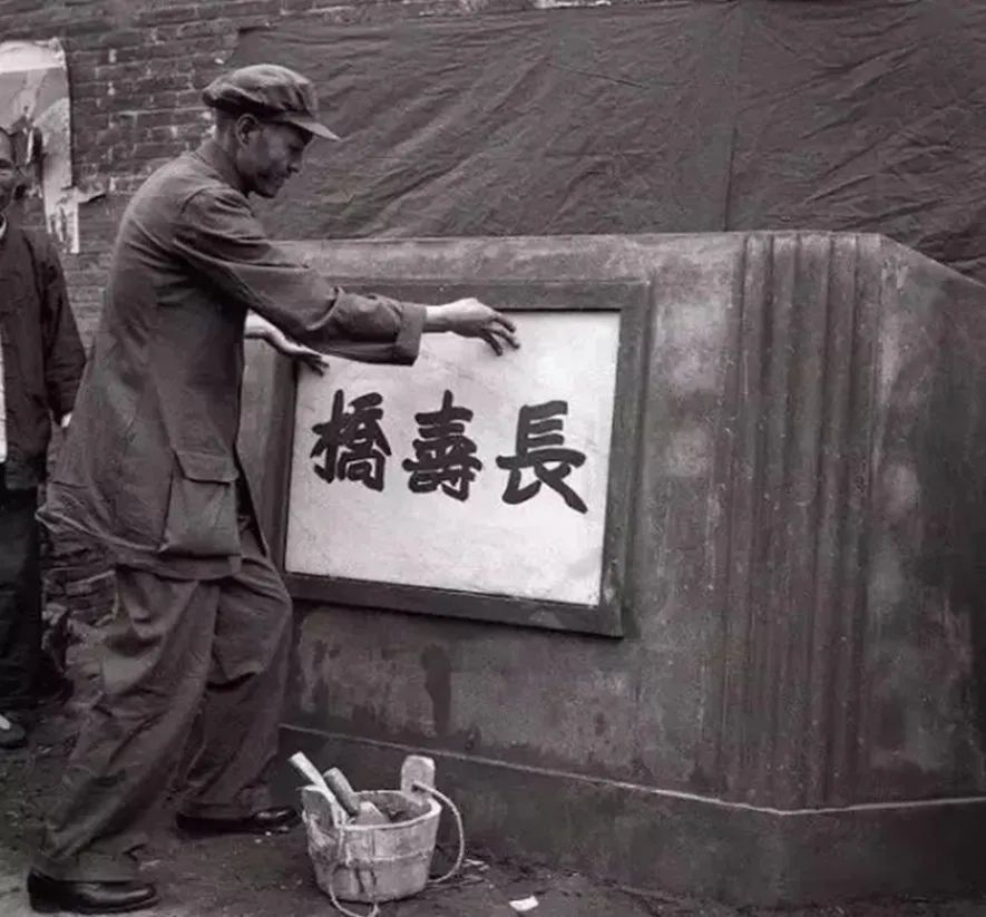 1951年5月28日,长寿桥奠基典礼上,时任普陀区区长张应举将长寿桥铭牌贴牢