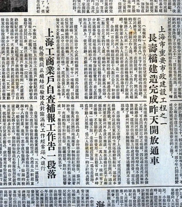 长寿路桥,1951年5月28日奠基开工,1953年9月28日建成通车。据《普陀地名志》记载,此桥为永久性大型桥梁,重力式桩基,钢筋混凝土单悬臂梁,五孔。长101.4米,车行道宽14.5米,两侧人行道各宽2.8米,梁底标高6.56米,水泥栏杆,载重为20吨。