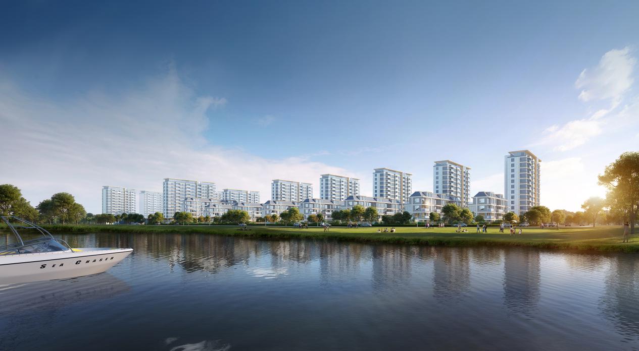 项目东侧紧邻河岸,西侧则是超600亩金海湿地公园,植被群落丰富,约56种鸟类栖息,是上海外环绿带上以湿地为特色公园。项目被自然环绕,自成诗意栖居的都市绿洲。项目规划上充分考量居住舒适度,将无遮挡的视野直面公园,把向公众开放的自然意趣和私家享有的静谧融合一体,场景化呈现一处“流动的自然”空间。