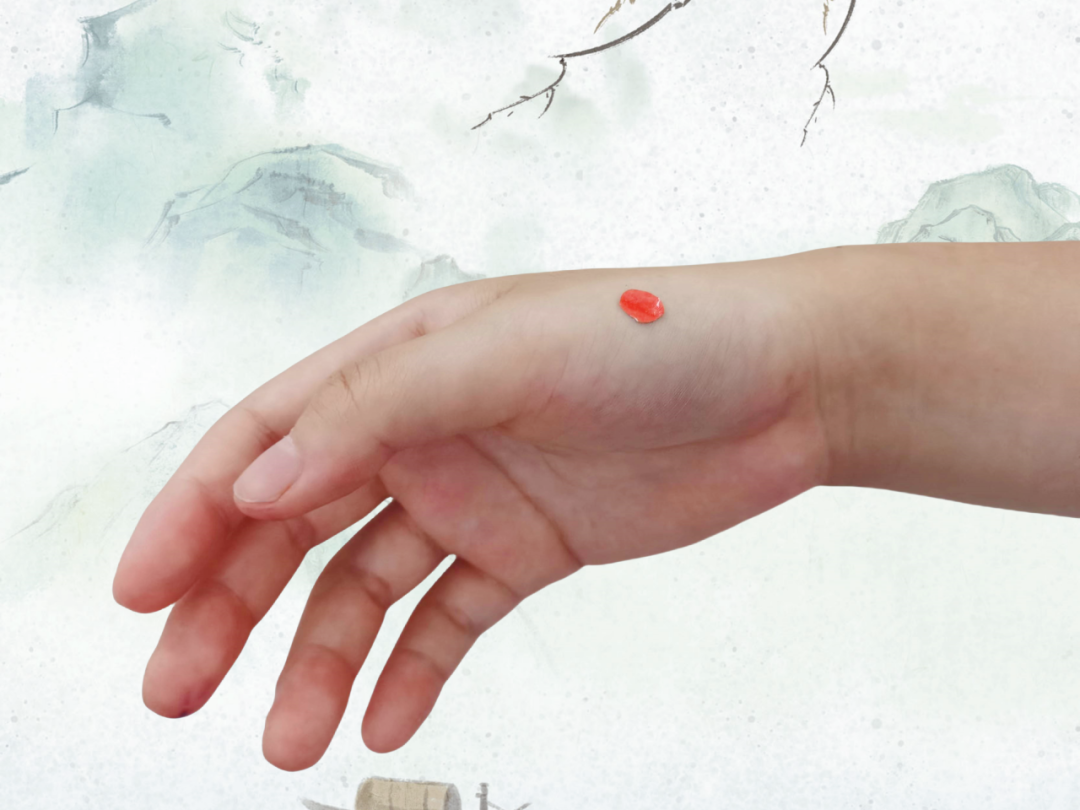 【取穴】第1步:仰掌;第2步:在第1掌指关节后,第1掌骨中点,掌后白肉隆起(大鱼际肌)的边缘(赤白肉际),按压有酸胀处,即为本穴。