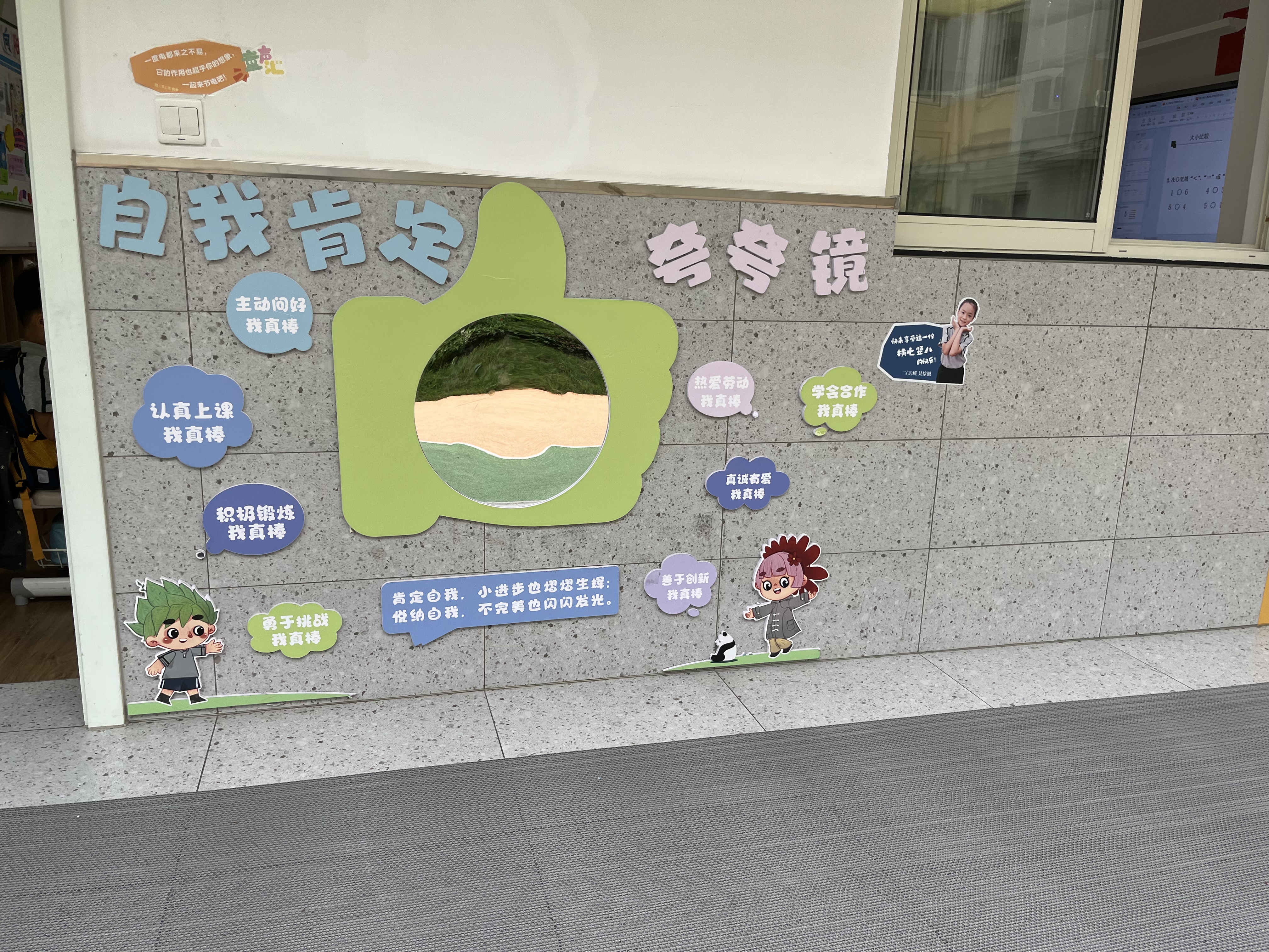 “我很喜欢我的学校,在这里每天都很开心。”一年级的胡宏照着教室门口的“自我肯定夸夸镜”,笑着说道。