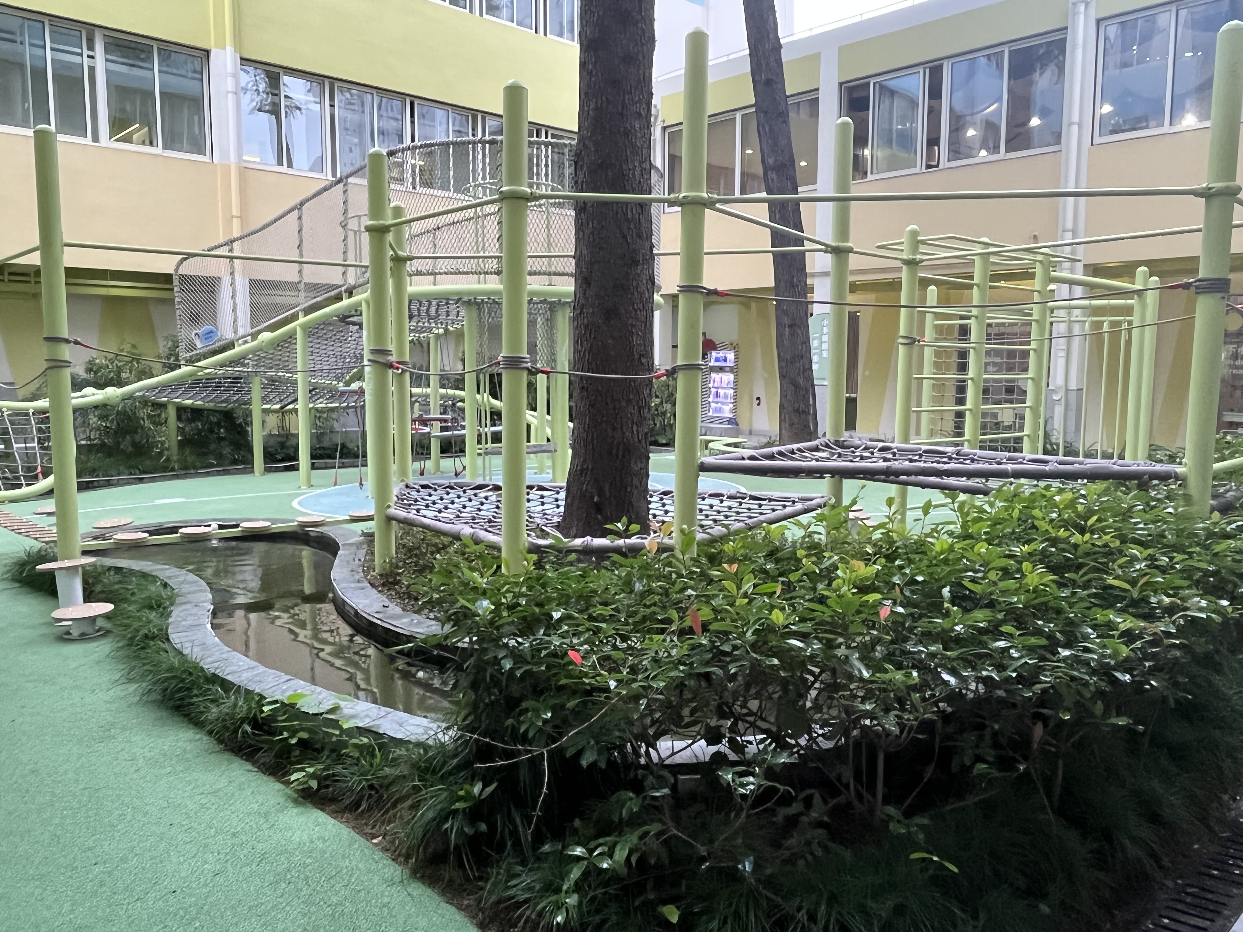 比如学校教学楼深处,有一处“绳索乐园”,这里甚至还挖出了一条小小的“小道”,养鱼的同时,多了灵动的乐趣。紧挨乐园,原来的仓库被改造成小笋芽阅读空间,墙壁全部换成玻璃,以开阔空间。