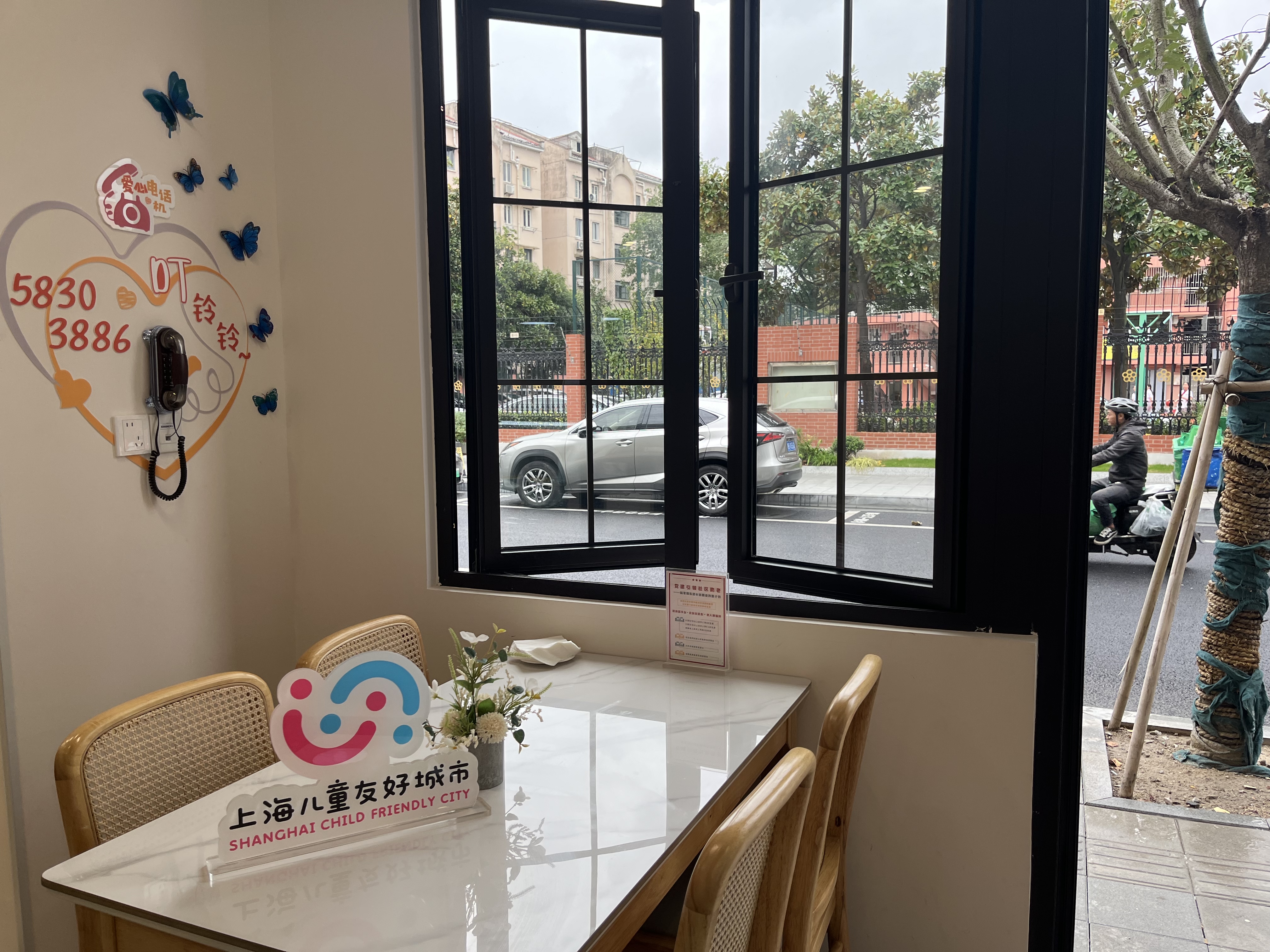 而建平西校对面的咖啡吧,更是将孩子们的童悦空间放大。澎湃新闻记者看到,不大的两层小楼,一楼可以作为咖啡吧、社区用餐点,户外布置成花园式休息点。二楼则是全龄友好社区,综合活动区、快乐阅读区、接待咨询区、共享琴房。每到放学时段,这里必定“人满为患”。