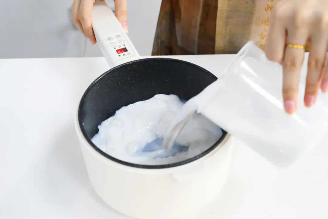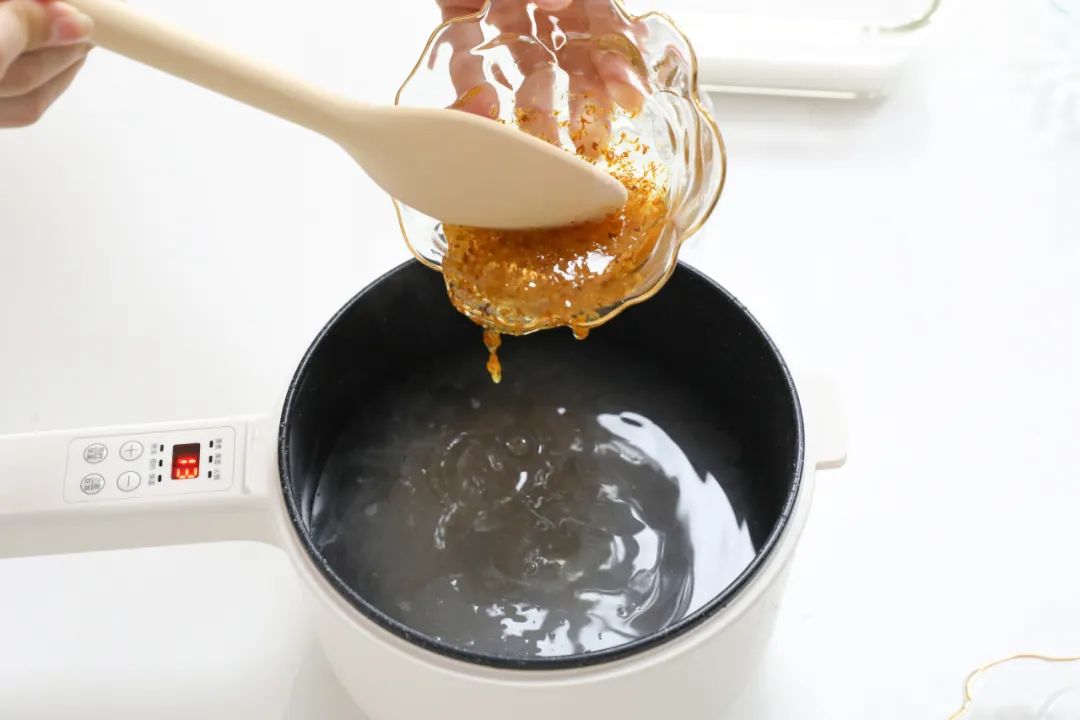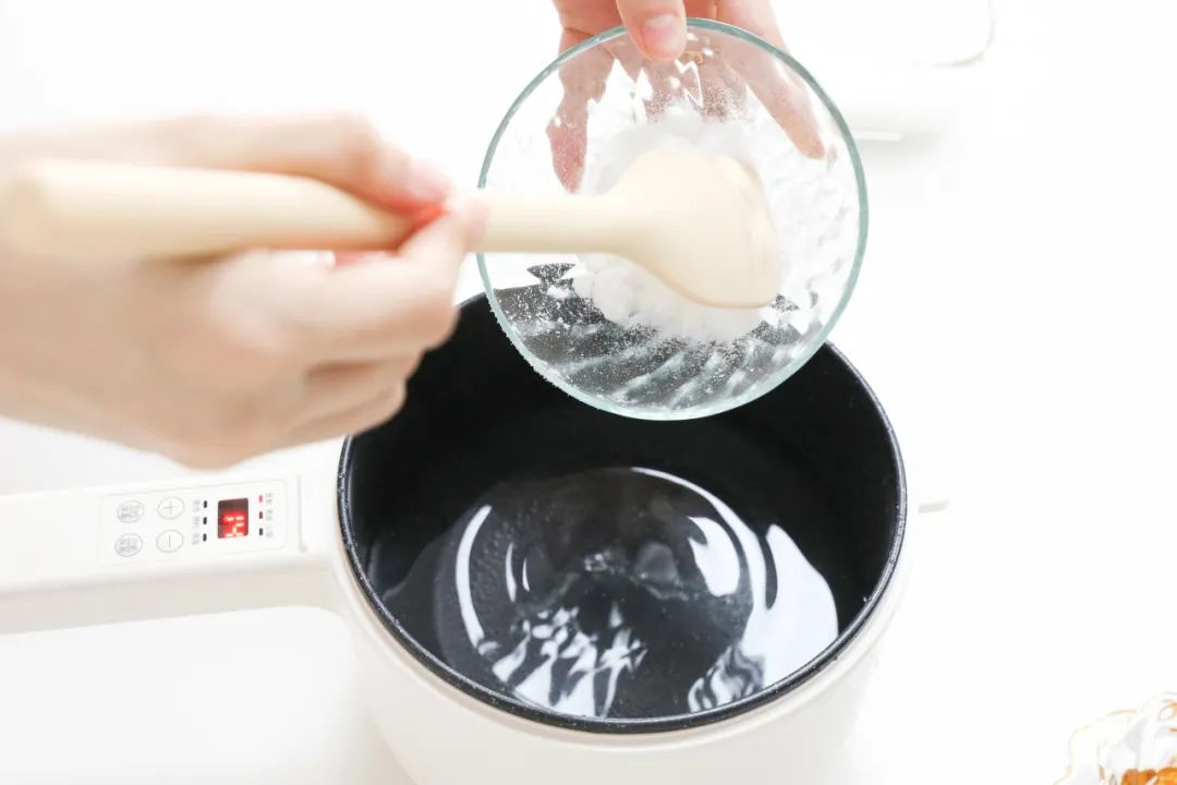 将准备好的材料分别加入锅中,小火加热搅拌至微微沸腾,便可倒入容器内等待冷却凝固。