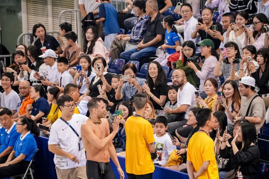 第一时间抢到门票的夏英英,原本就感到很幸运了,却没想到,还有更大的惊喜在后头。主项自由泳的潘展乐,这次参加了男子100米混合泳的项目,夏英英的这张预赛门票,物超所值。当潘展乐结束比赛后,他特地绕场一周,和观众们挥手互动,他走到夏英英的面前,微笑着向大家致谢。“没想到,真的没想到!”夏英英激动地告诉记者,“组委会特别安排了潘乐乐(潘展乐昵称)和我们这边的观众打招呼,能近距离看到乐乐,我特别激动,特别开心。今天一整天的快乐指数,一大早就被这个安排填得满满当当。”