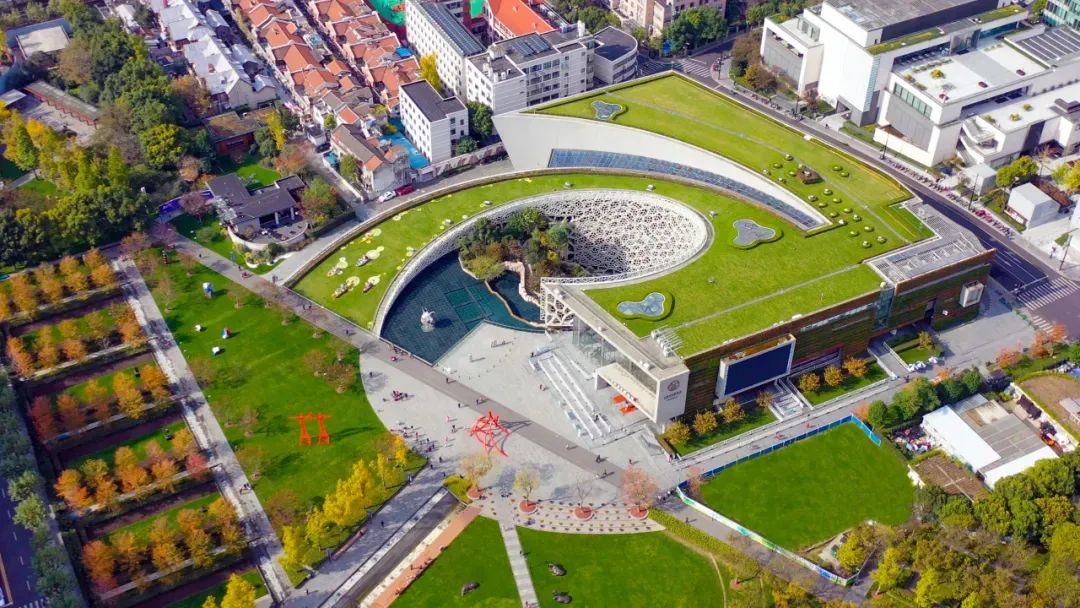 上海自然博物馆毗邻静安雕塑公园,设计师在充分考察周边环境的基础上,在建筑的“螺壳”表面种植了大片的绿色草坪,实现了建筑与公园环境的融合统一,增强了建筑与自然、人文、艺术的三重对话。