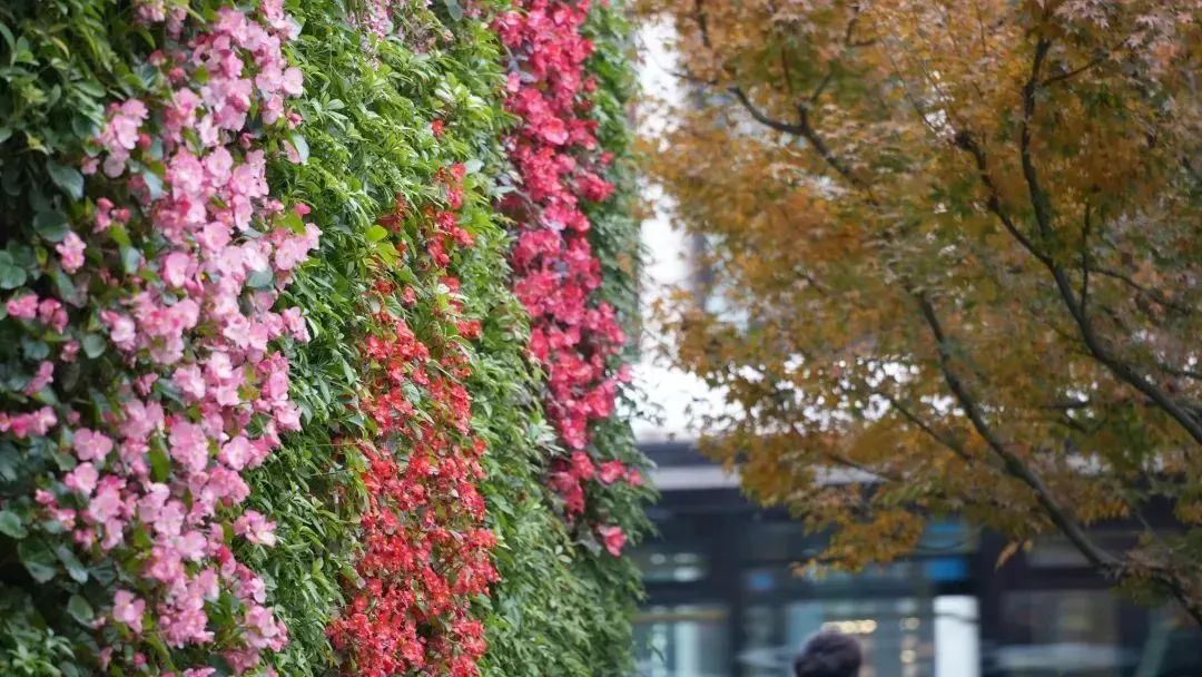 绿墙位于建筑背阴面,墙体高大但作业面小,养护难度较大,因此,针对性地选择了耐阴、少修剪、易养护管理的绿墙植物品种,如黄色系的亮晶女贞、金线蒲、红色的矾根、彩叶的花叶络石、绿色的瓜子黄杨和开花的毛鹃等,共计4545株垂直绿化专用苗,同时,安装节水自动灌溉系统智能给水。