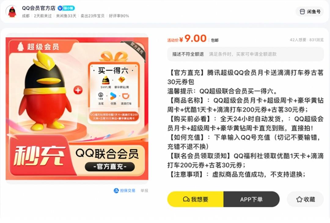 据闲鱼卡券行业工作人员介绍,此次QQ会员官方店入驻诚意满满,结合闲鱼年轻人会玩会省钱的特色,推出了专属定制的QQ会员全家桶,买一得六加量不加价,不仅有王牌产品超级会员、还附赠了豪华黄钻,以及覆盖吃喝玩乐的生活权益。