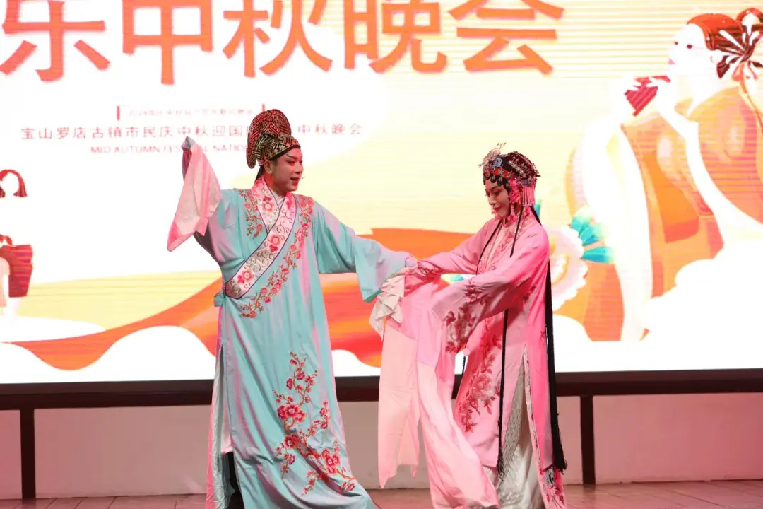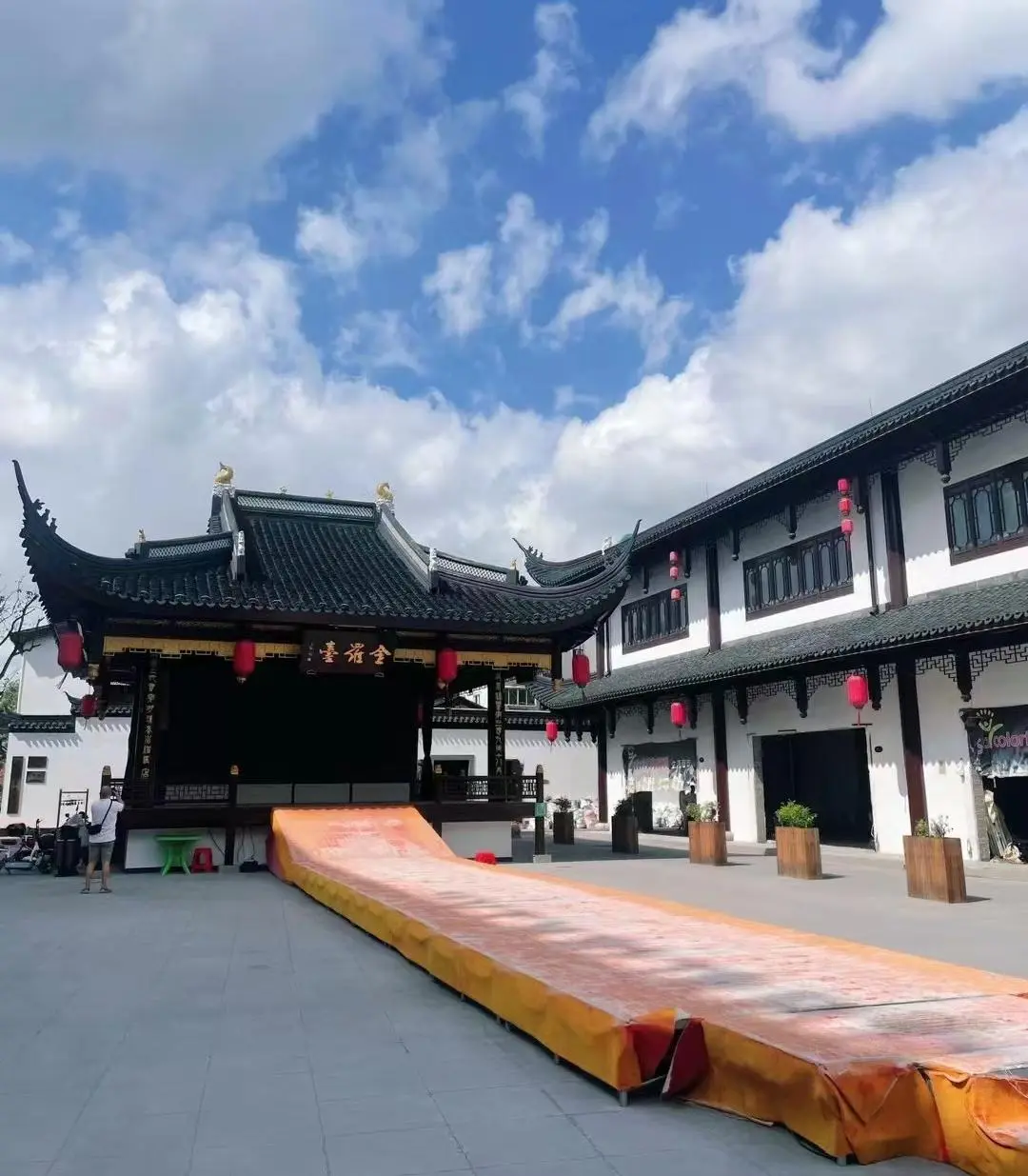 坐西面东居亭前广场中央的“金罗台”,完全仿江南古戏台样式而作,台内檐柱丹漆,四翼远伸高翘,一条长18米的T台,上邀戏曲名家和爱乐百姓共同登台,吹拉弹唱演绎古镇700年丰厚底蕴。