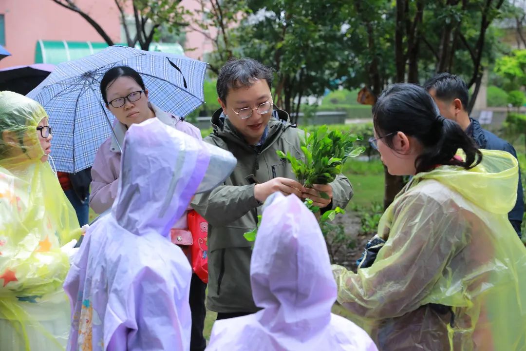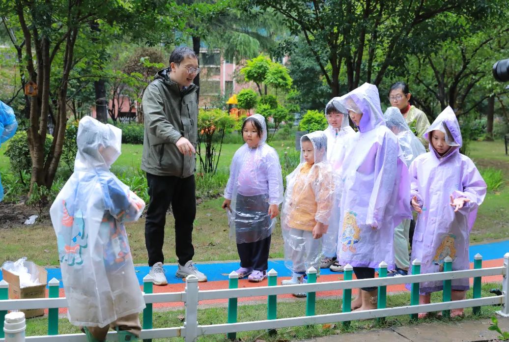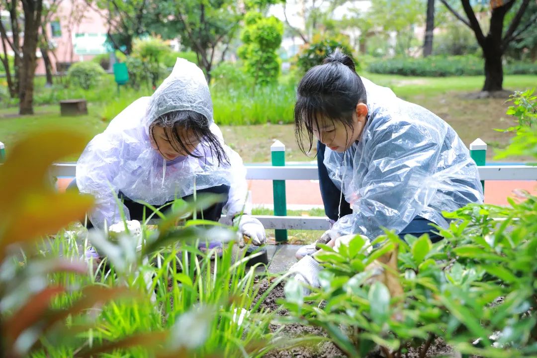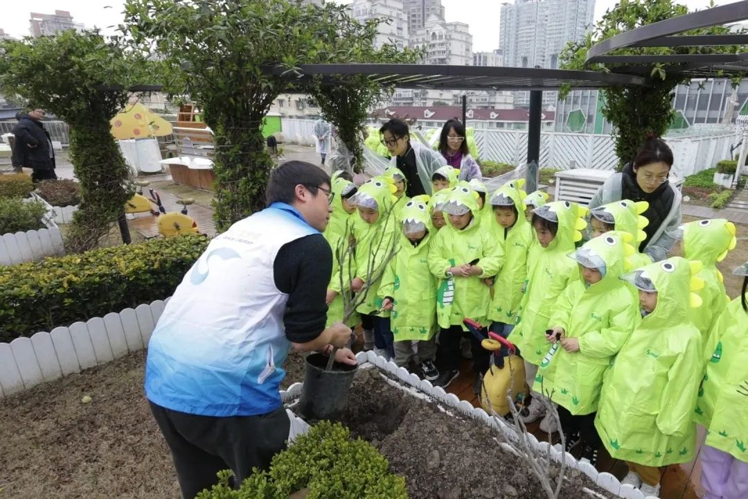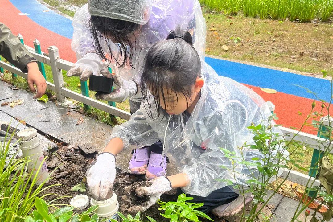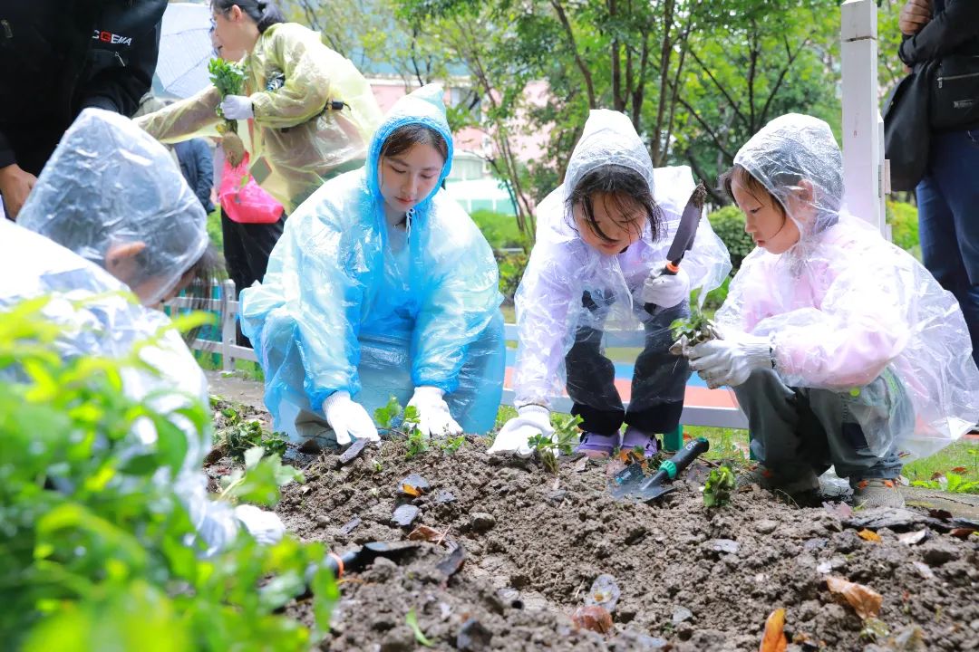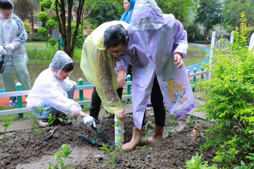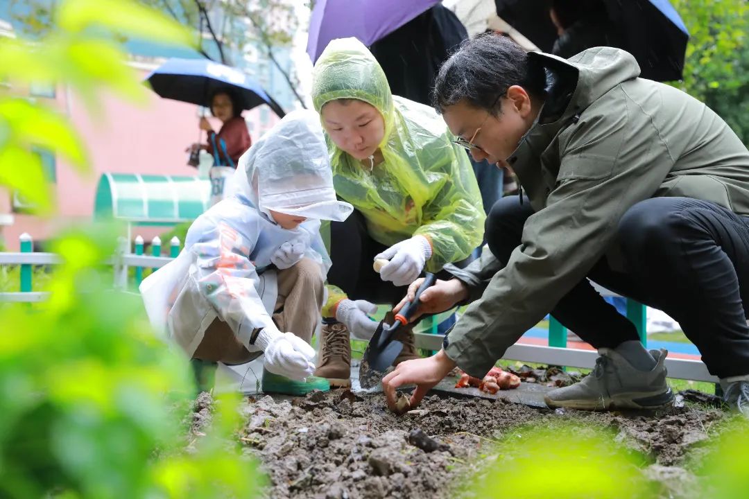 草莓、郁金香、栀子花……各种植物的种子与小苗,在孩子们的小手中找到了新家。他们身穿雨披,戴着手套,手握铁锹,将一株株小苗种入松软的泥土中,再小心翼翼地踩实。