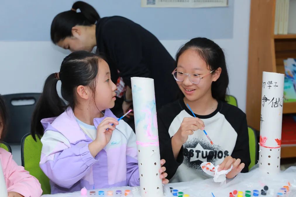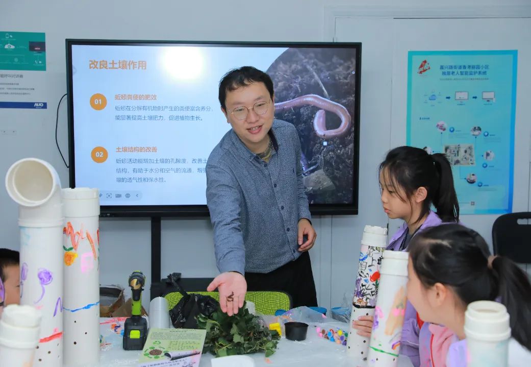 在老师的指导下,孩子们还亲手制作了“蚯蚓塔”,并将其安放在花园里,为这片土地注入了新的活力。老师一边将蚯蚓和落叶放入蚯蚓塔,一边解释道:“蚯蚓塔是一种利用蚯蚓分解有机物的环保装置,能改善土壤质量,促进生态环境的形成。我们要学会利用自然的馈赠,与自然和谐共处。”