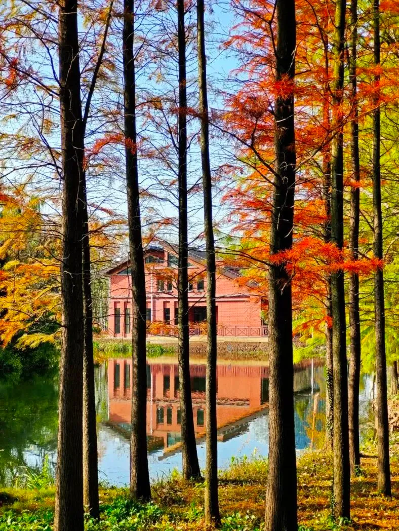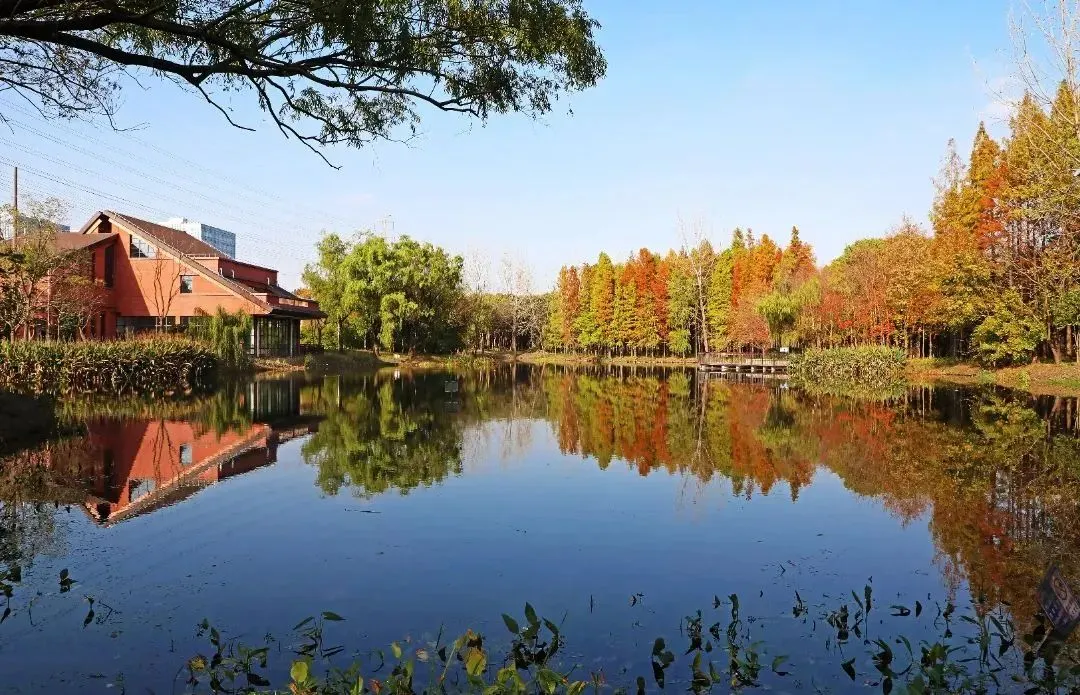 园内植物以“秋色+水生”为特色,适应性强、抗逆性好,生态功能与景观效果并重。秀丽挺拔的水杉与湖泊一起构成了天然的水林秘境,装点了公园秋色。