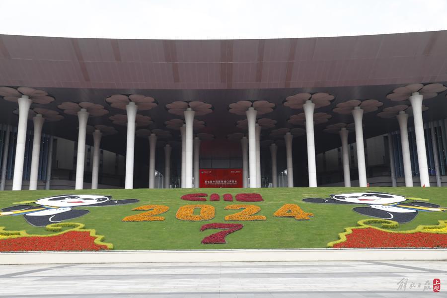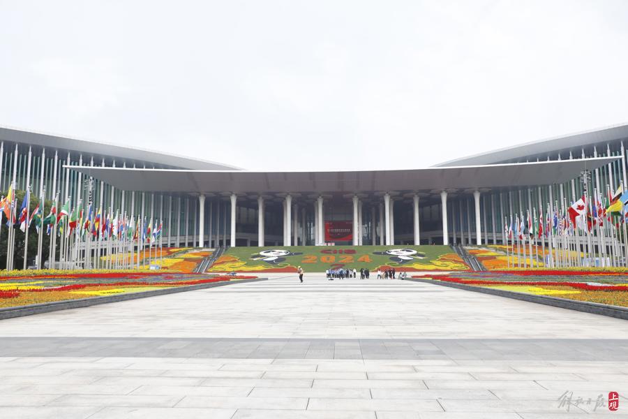 2024年11月4日,申城天朗气清,国家会展中心(上海)繁花锦簇“四叶草”,南北广场和东西出入口处彩旗飘扬,以喜庆热烈气氛静待盛会开幕。