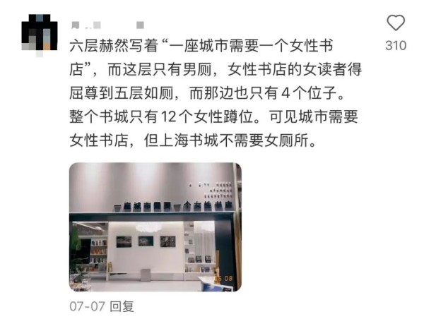 还有6层所谓的女性书店,15米之外的洗手间居然是男厕所,女读者还得下楼方便。(昏过去...)