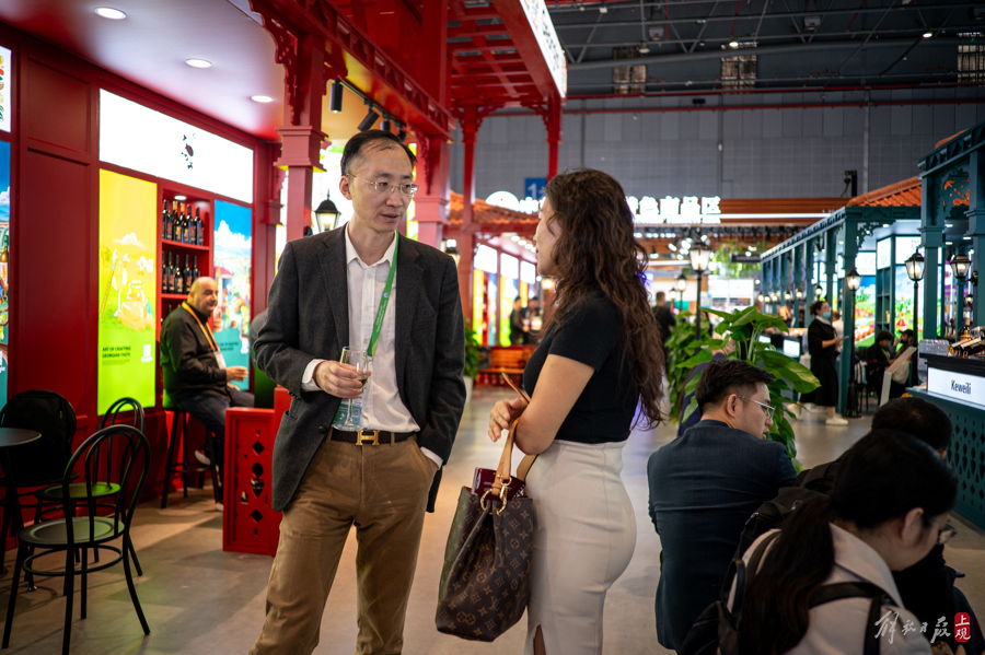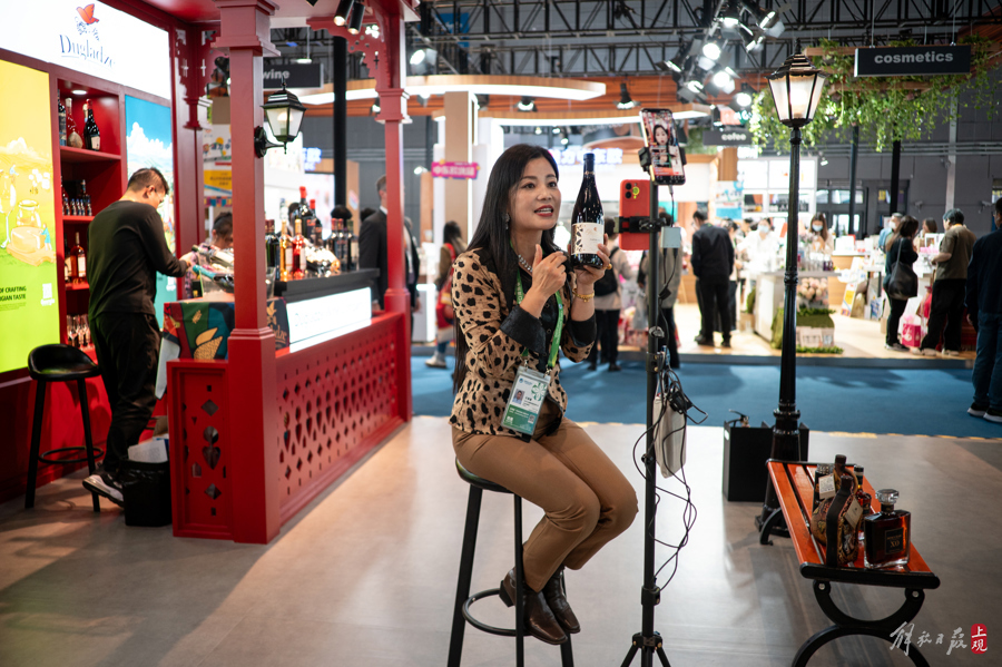 受惠于进博会的特殊关税政策,格鲁吉亚的红酒商家为进博会准备了特别的优惠折扣,通过场内直播的方式吸引中国消费者选购。