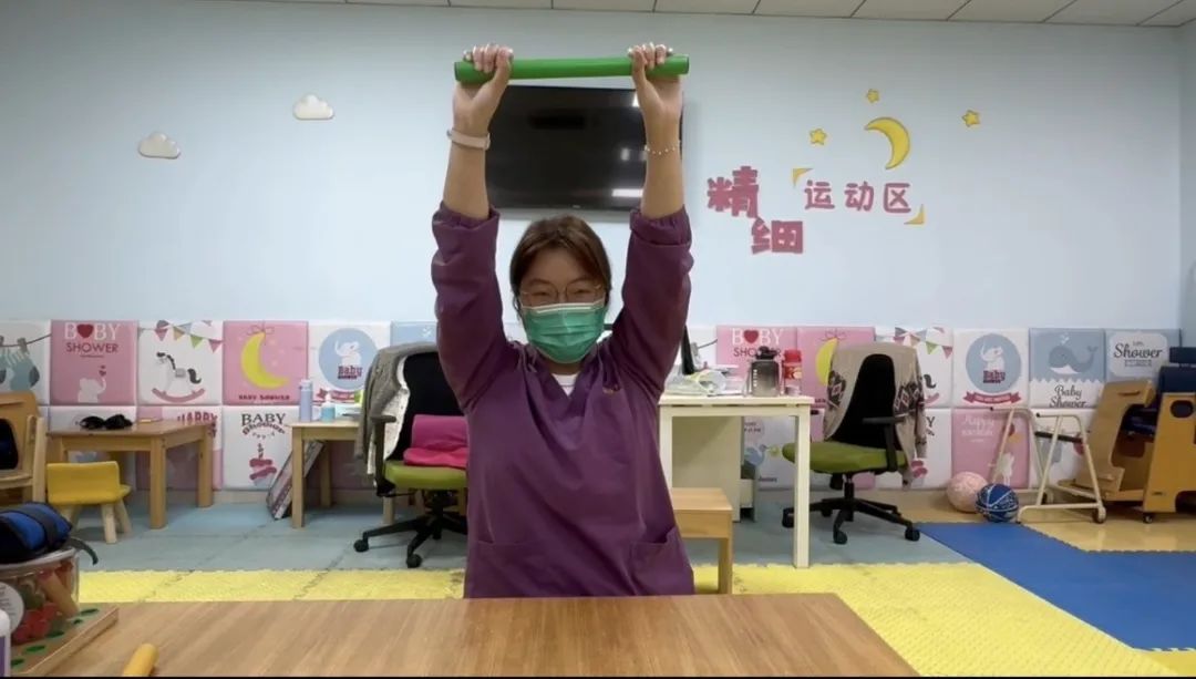 患者手持体操棒,缓慢上举,肘关节伸直。注意患侧若无抓握能力,可用弹性绷带固定患侧手;若患侧力量改善,可适当增加两手距离宽度(可锻炼患者的肌力和抓握能力)。