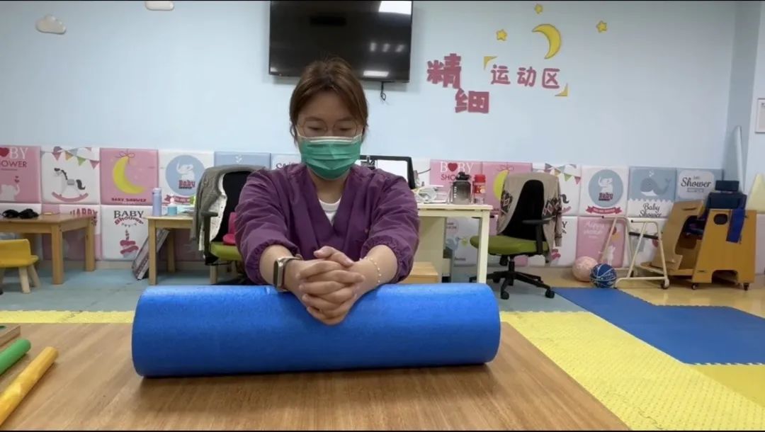 Bobath握手,将双上肢置于滚筒上,用健侧上肢带动患侧上肢,在滚筒上滚动(可锻炼患者上肢的协调性,增加上肢关节活动度)。