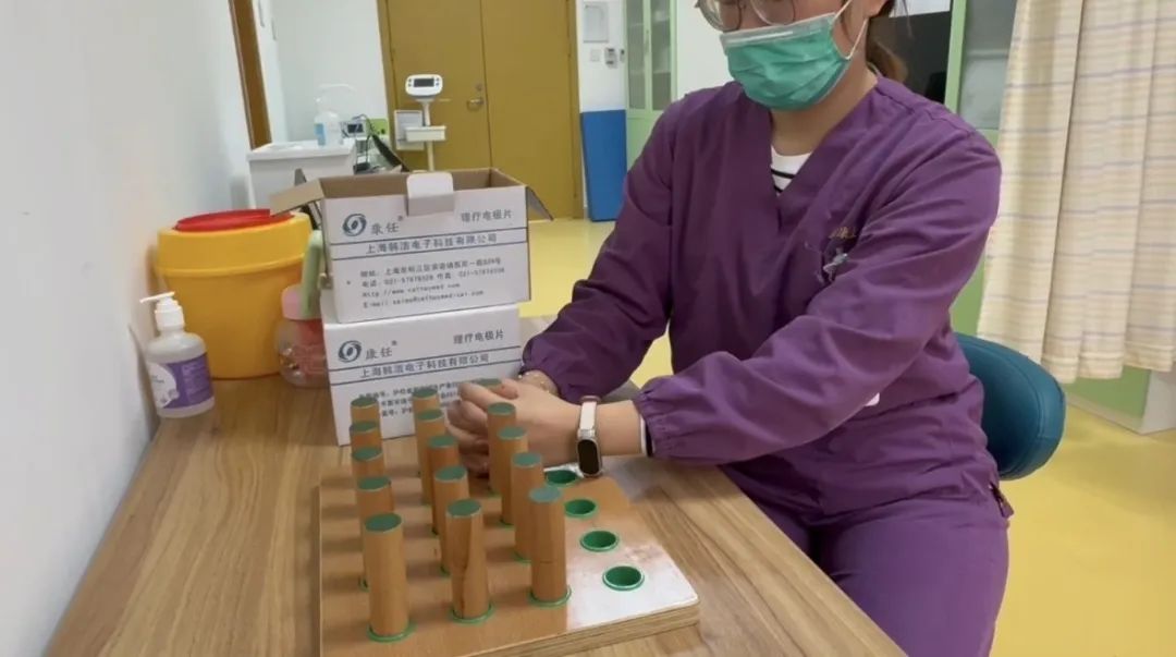 患者双手交叉,将低处木钉举至高处,再放至身旁一侧的盒子里(可锻炼患者肩关节活动度和坐位平衡,也锻炼了患者手眼协调的能力)。