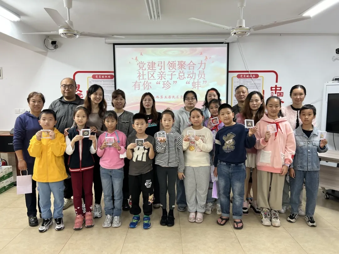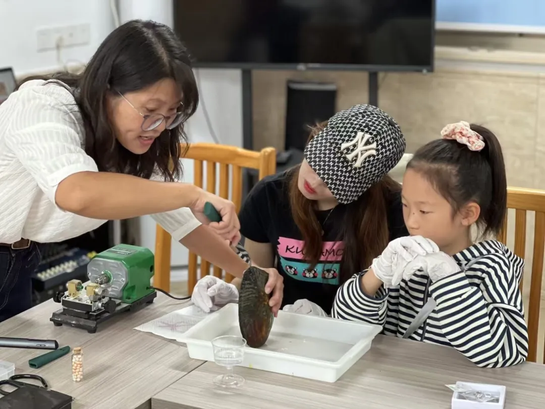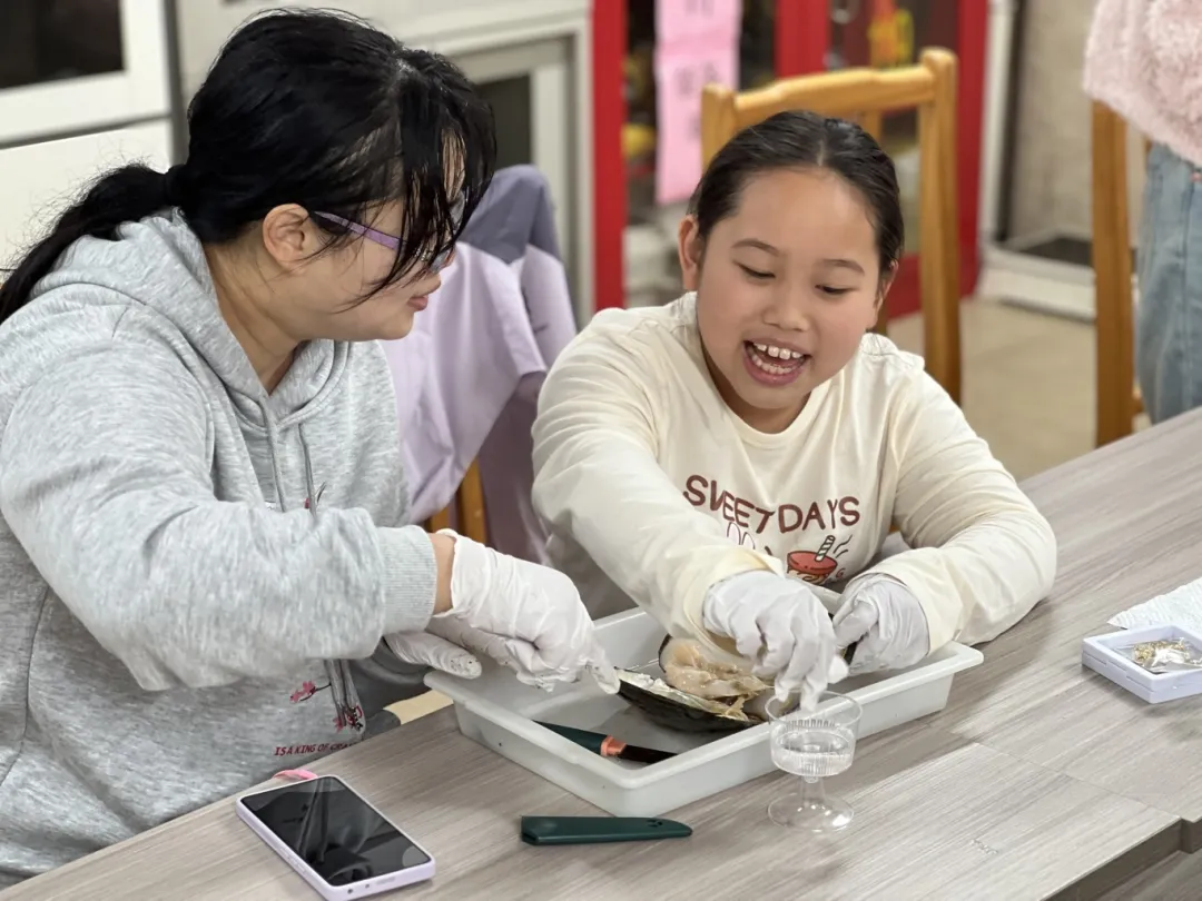 长江路第五居民区新时代文明实践站还组织开展了一场珍珠胸针手工制作活动。老师介绍了珍珠的产地、种类、形成过程,以及选择珍珠的标准、珍珠饰品在日常生活中应如何保养等知识。活动中,老师分发珍珠蚌以及开蚌工具,并手把手指导居民们如何开蚌取珠、洗珠抛光,大家跟随老师的步骤,撬蚌、取珠、清洗、打磨……经过努力,一颗颗饱满圆润的珍珠呈现在面前。居民们结合喜爱的配饰,用心制作专属于自己的胸针。制作完成后,大家迫不及待地戴上胸针并合影留念。参加活动的家长表示:“平时工作很忙,没时间陪孩子,感谢社区为我们提供这样的平台。”