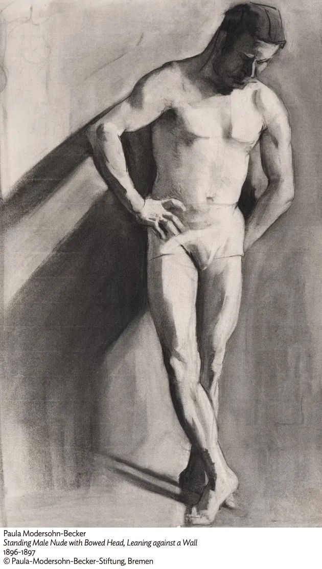 《站立男性裸体,低头倚墙》1896–97 年(保拉在学校期间的作品)