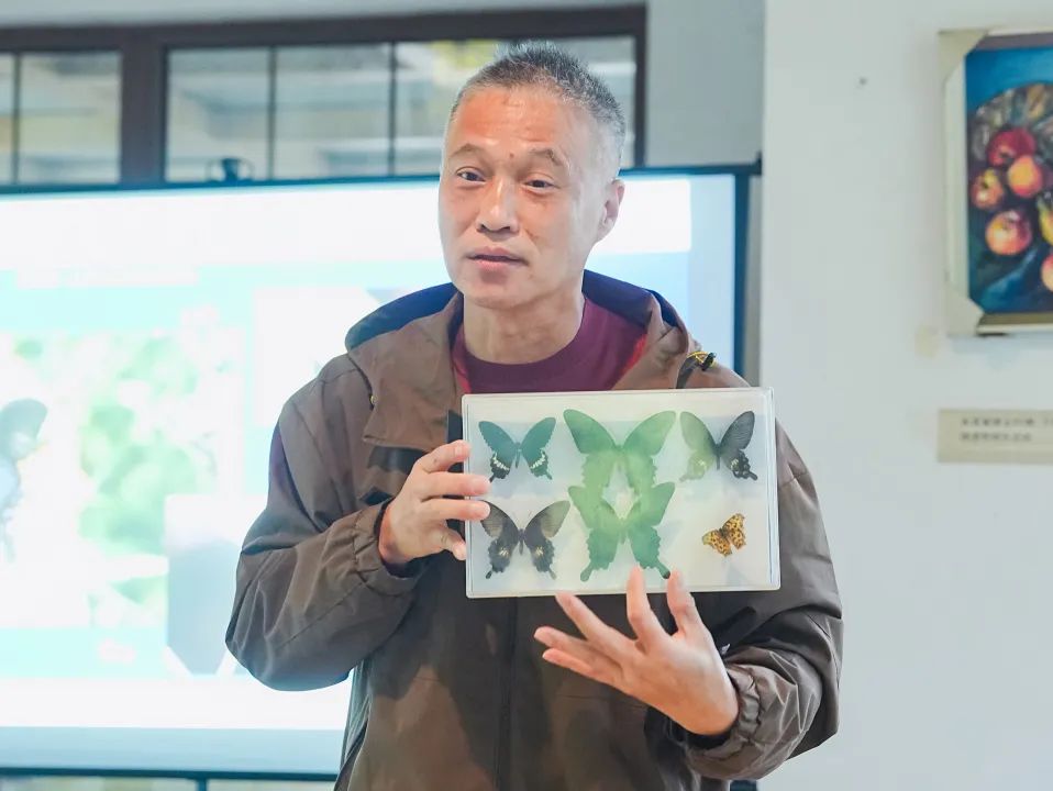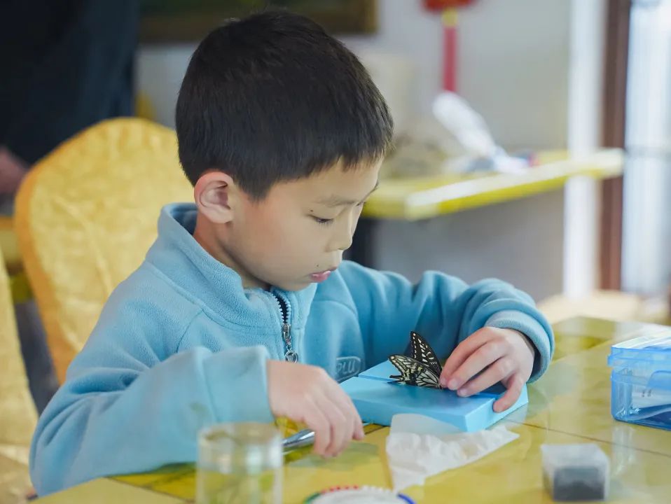 “上海本土最常见的蝴蝶有哪些?”本次活动主讲教师以上海常见的54种蝴蝶入手,以图文并茂的方式,介绍蝴蝶的形态特征、生活习性等,让参与讲座的学生和家长掌握准确、科学、有趣的蝴蝶基本知识,接着带大家进行蝴蝶标本制作,孩子们在老师的指导下用展翅纸将蝴蝶翅膀固定,待干燥定型后,用镊子将身体从针上取下,放入标本盒中固定,漂亮的蝴蝶标本就制作完成啦!