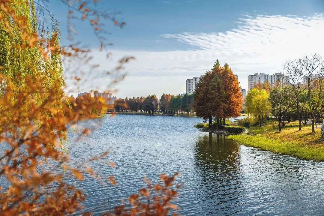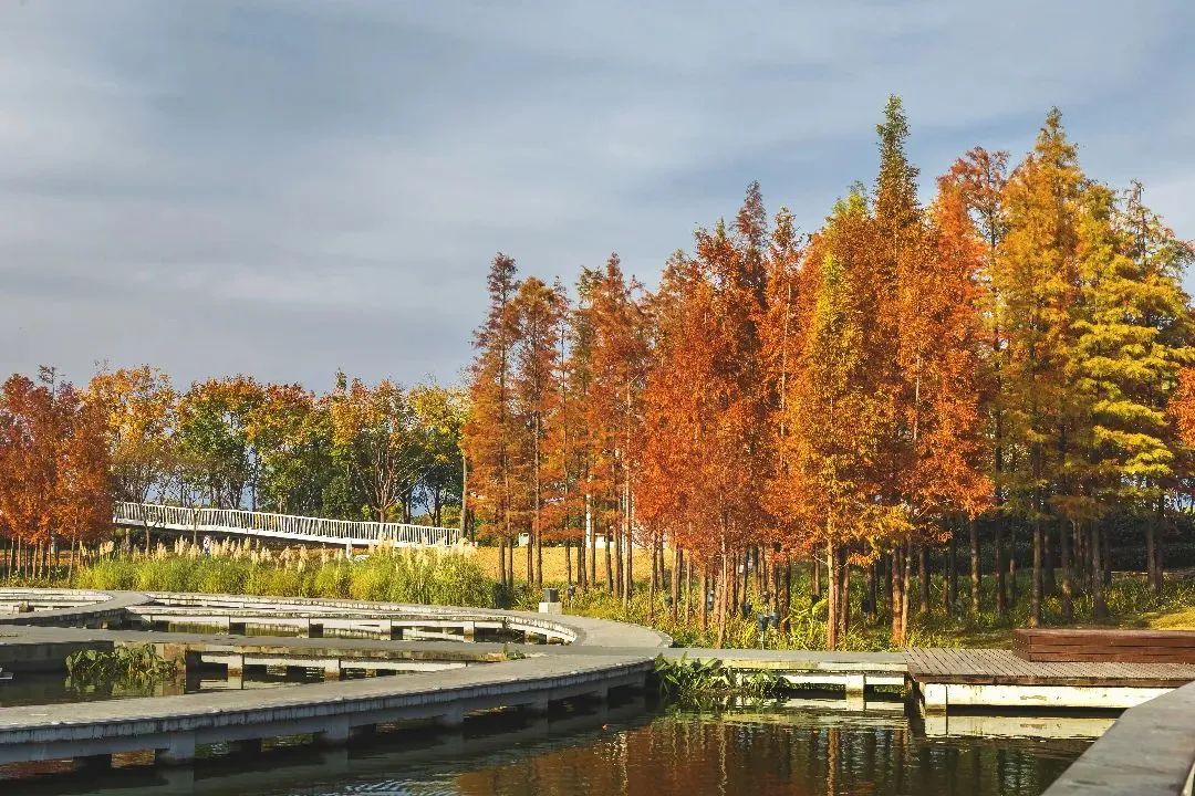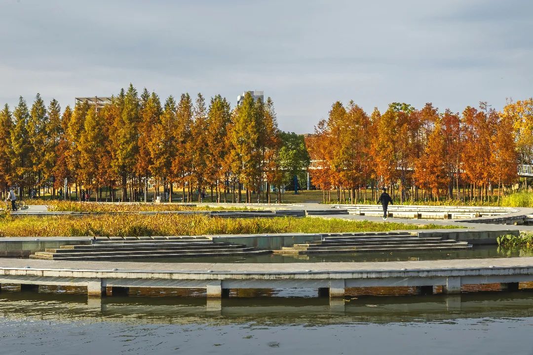 远香湖的环湖道路包含步道、活力跑道、城市骑行道,沿途将上海保利大剧院、嘉定图书馆等网红建筑串联了起来。骑行途中,可以欣赏到秋日层林尽染的远香湖,整片湖水沐浴在阳光中,光影与水色相互交融,亦诗亦画。