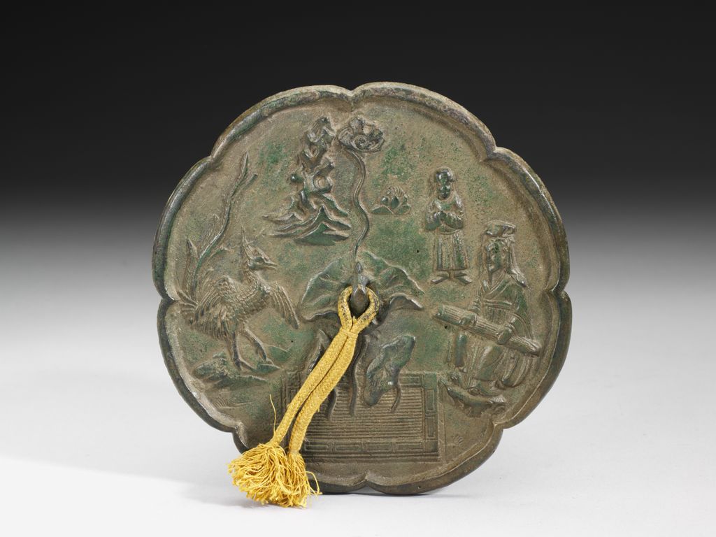 琴地位崇高,善琴者甚有神人化的现象。宋代《仿唐真子飞霜镜》中的琴士坐高椅抚琴。画面布满祥瑞,有凤凰、仙山、祥云、日出和“龟游荷叶”,暗示琴士为仙。目前对琴仙原型众说纷纭,一说是伯牙,另有根据一件带“侯瑾之”镜铭的例证,考据为东汉隐士侯瑾。值得注意的是,侯瑾是弹“筝”音乐家。此类题材盛行于唐代,但此件为宋仿。