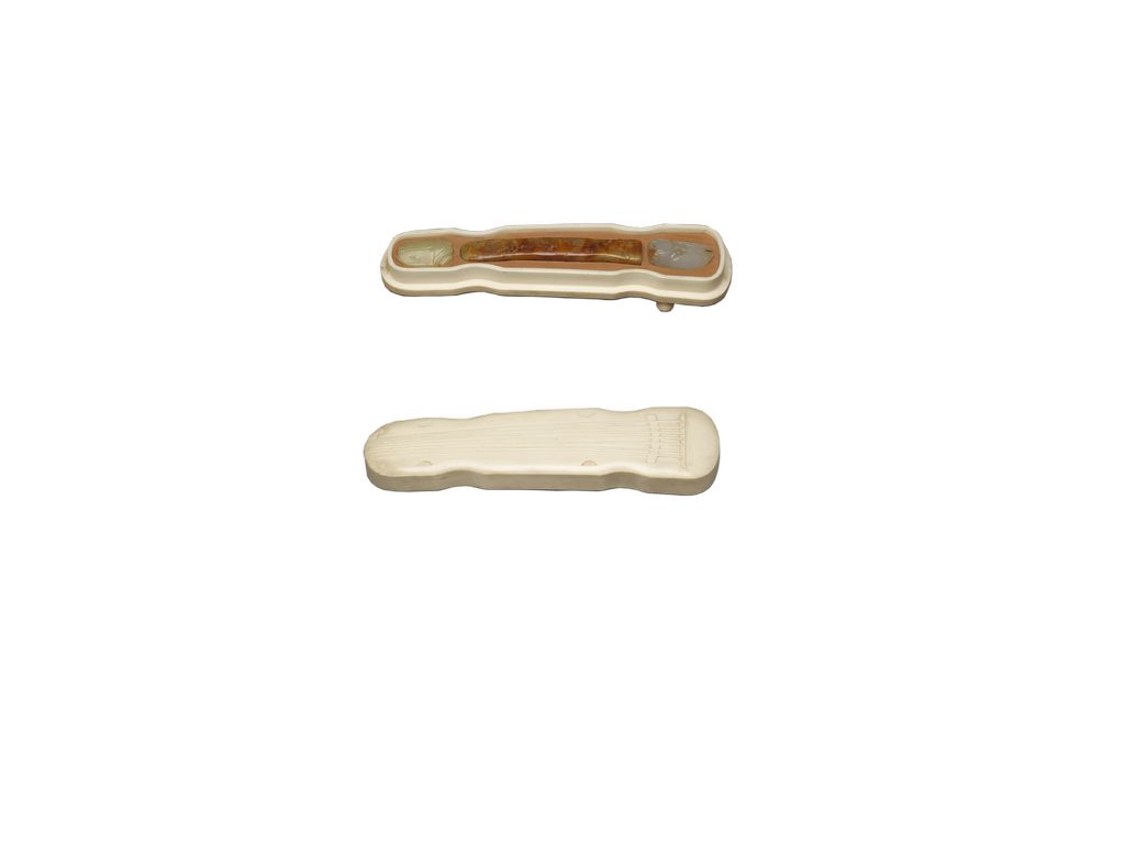 琴形玉饰,正反面均仔细刻划琴的各部件,惟独正面缺琴弦,谓之“无弦琴”。典故取自陶渊明抚弄无弦琴,言:“但得琴中趣,何需弦上音”,突现文人重视琴心大于琴艺之态度。此玉盛放于象牙琴式盒内。盒的琴形是有弦造形,与盒内的无弦琴玉饰,相映成趣。