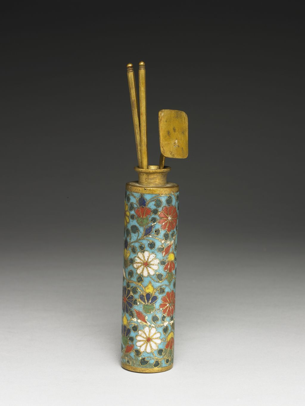 箸瓶亦是香具。瓶中插着焚香用的香铲与香箸。铜质,表面鎏金,瓶身装饰丝珐琅作成的缠枝菊花纹。明代以降,箸瓶与香炉、香盒成为固定的香具组合,称为“炉瓶三事”。