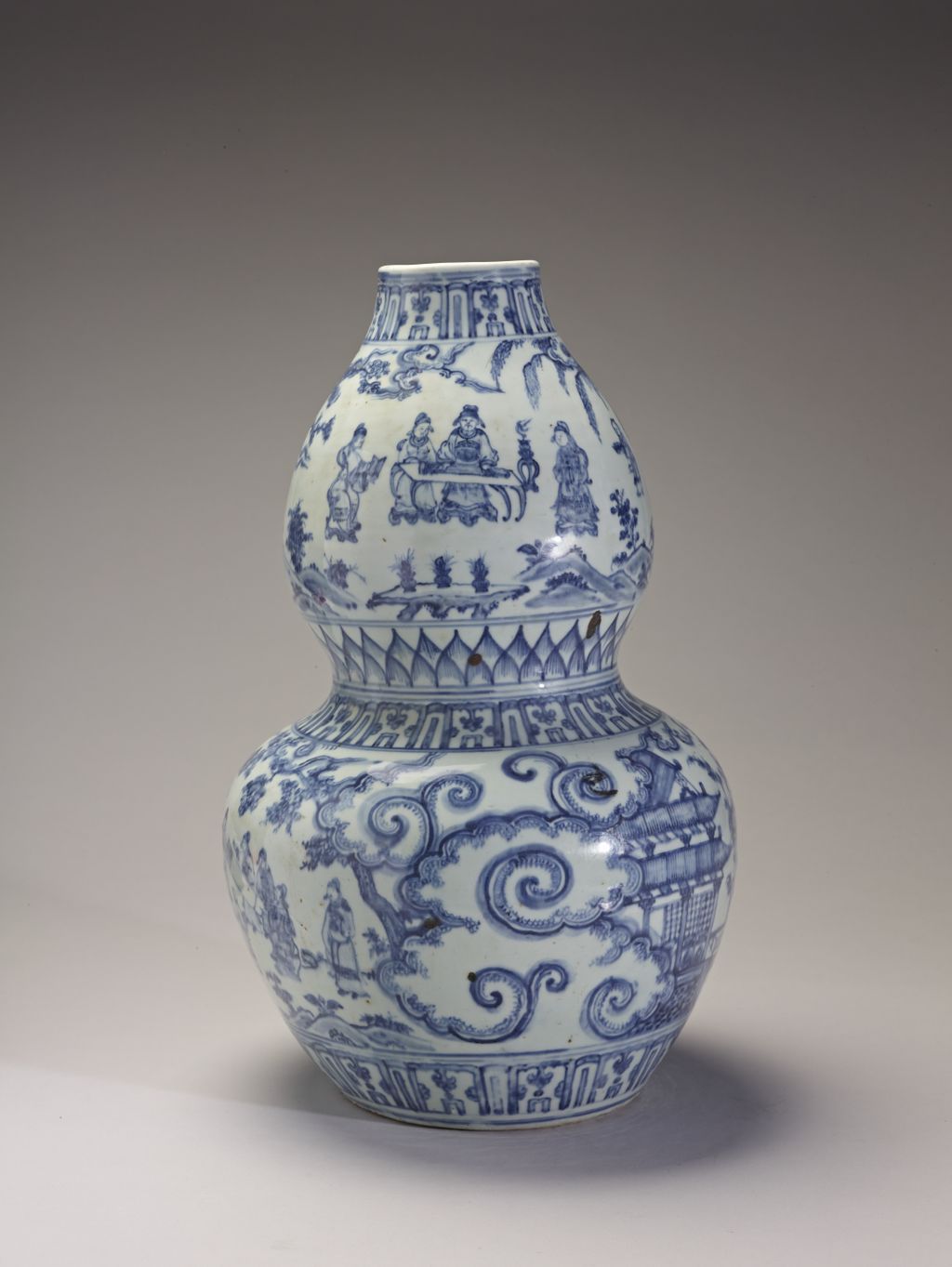 葫芦瓶,以青花描绘多层纹饰。器身上半部绘十八文人与几名童子随侍,分别作“琴”、“棋”、“书”、“画”等场景,并以细卷云纹间隔各景。题材描绘唐太宗所收聘的十八位学士,但此处人物描绘并无强调与真实人物连结,而是以琴棋书画活动营造文人身份,由此凸显学士所具备的学识与品味。其中,琴的场面描绘一学士坐于桌前弹琴,另有三学士,或立或坐,于侧听琴。琴桌旁亦设香几,操琴焚香,极为讲究。
