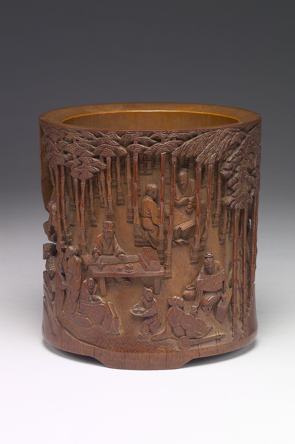 清早期雕竹竹林七贤笔筒呈现“琴与高士”的场景。