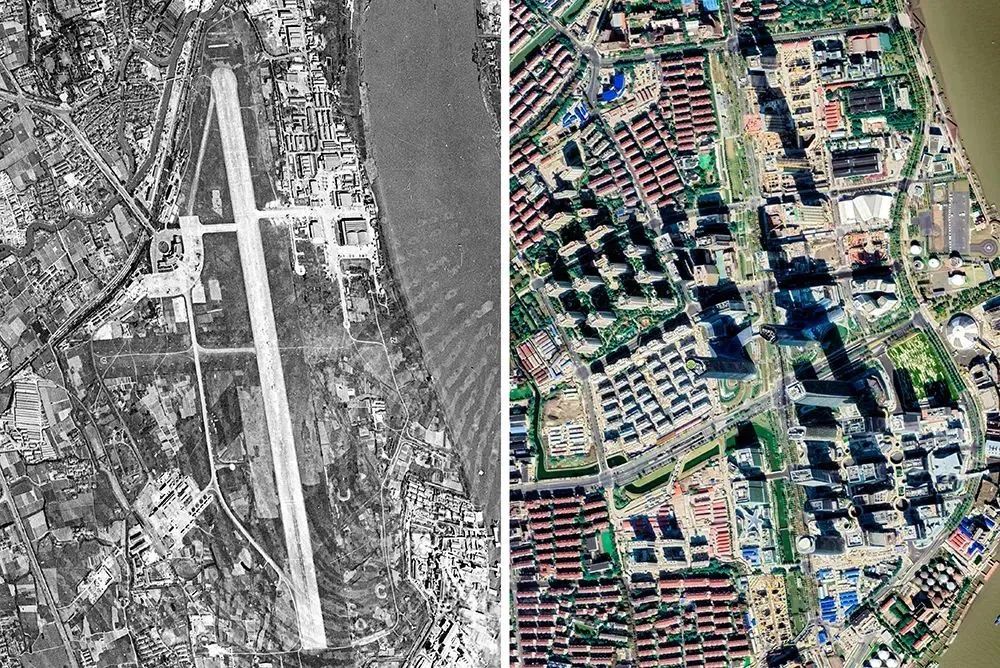 左为龙华机场,始建于1917年;右为龙华机场跑道改造而成的线性公园