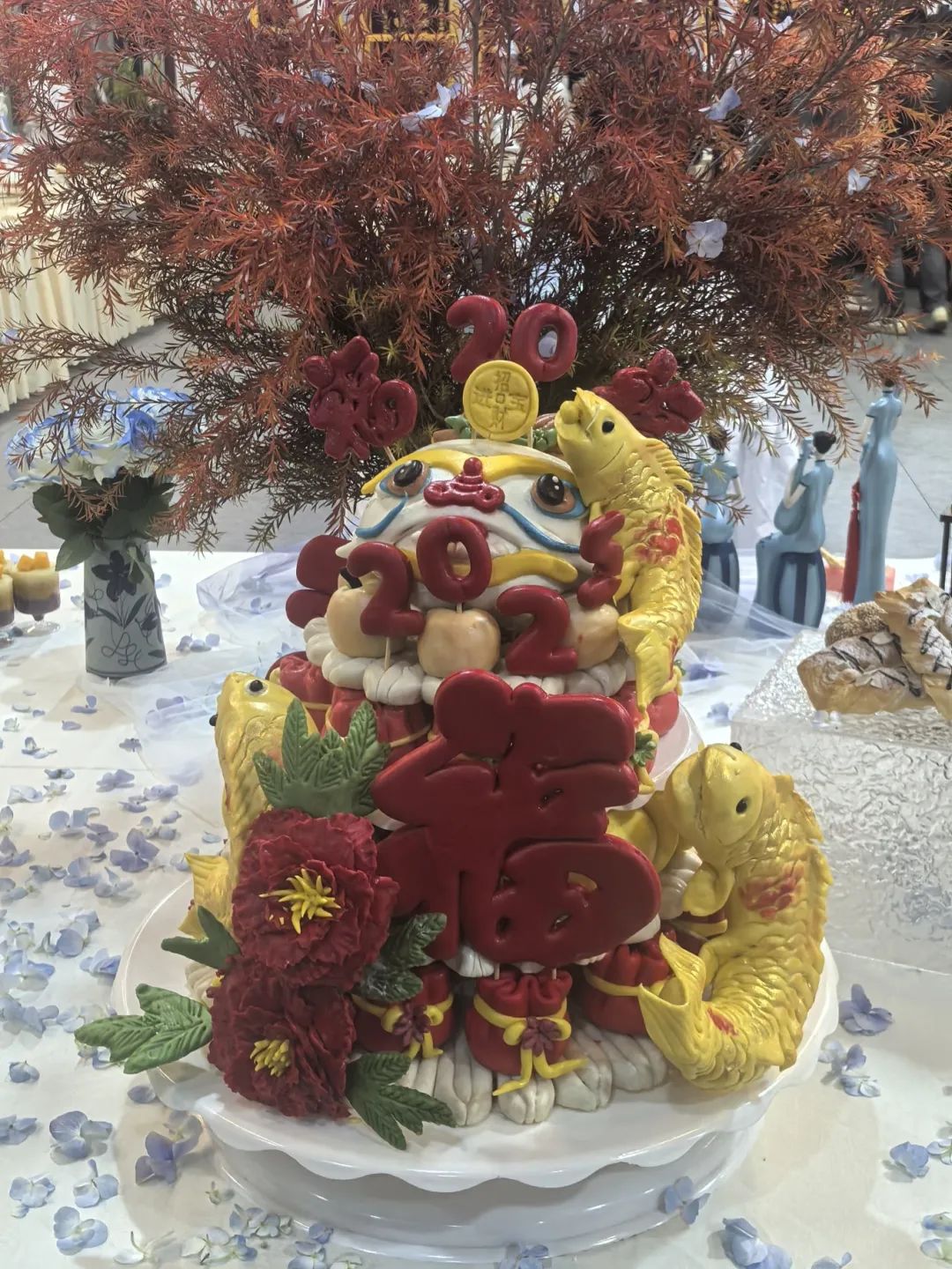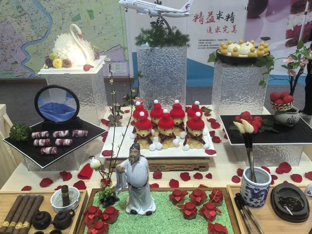 玉兔蹦跳的小馒头,以假乱真的荔枝,姿态优雅的天鹅(酥),皱褶精细的各类菜包、鲜肉包……选手们在呈现中式点心的同时,不忘与西点结合,纯巧克力花瓶、羊角包、椰丝包、法式棍子、蝴蝶酥等西点大拼盘,还有酷似海参炖品的布丁,头戴小红帽的人形杨枝甘露……令人眼花缭乱。