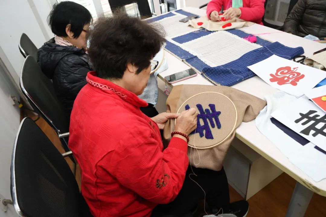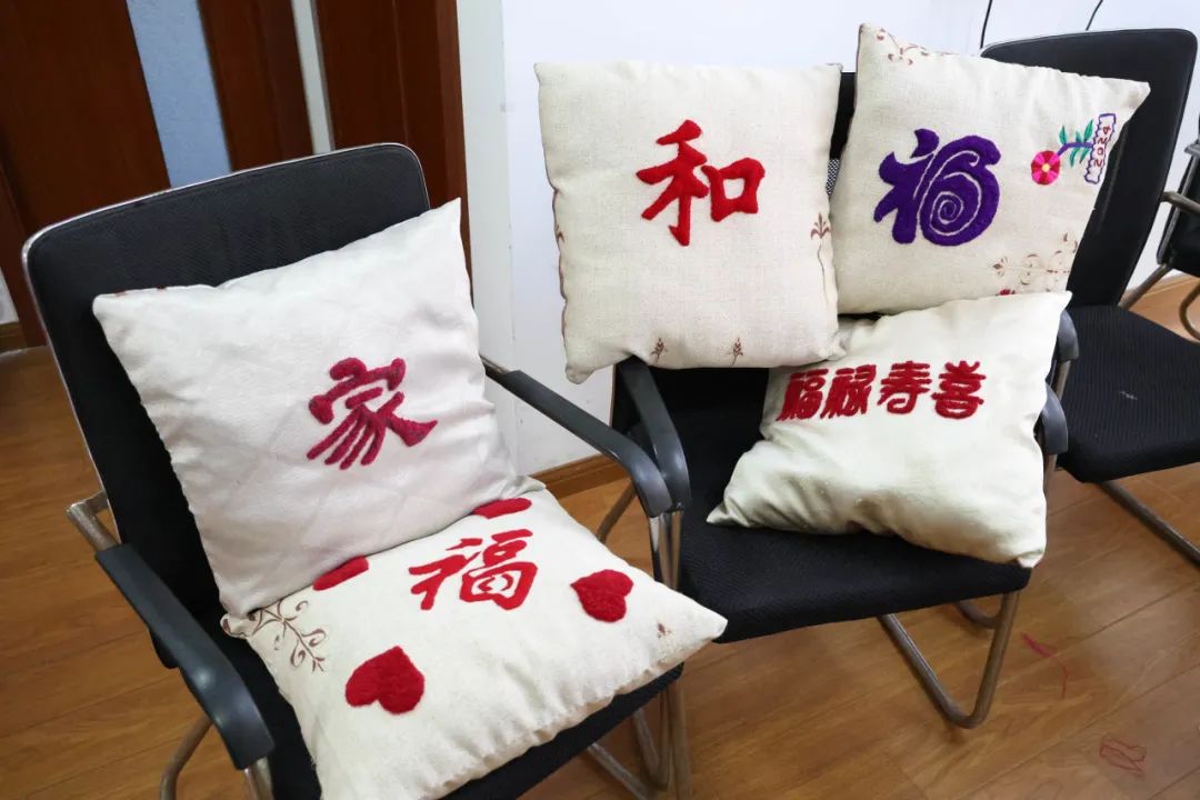 另一边放着已经完工的靠垫,典雅的花色配上吉祥的字符,在这冬日里显得格外舒适。据介绍,巧手帮自2014年成立起,从10余人壮大到现在24人,每年都会为辖区85岁以上的老人制作各类过冬的暖心小物件。