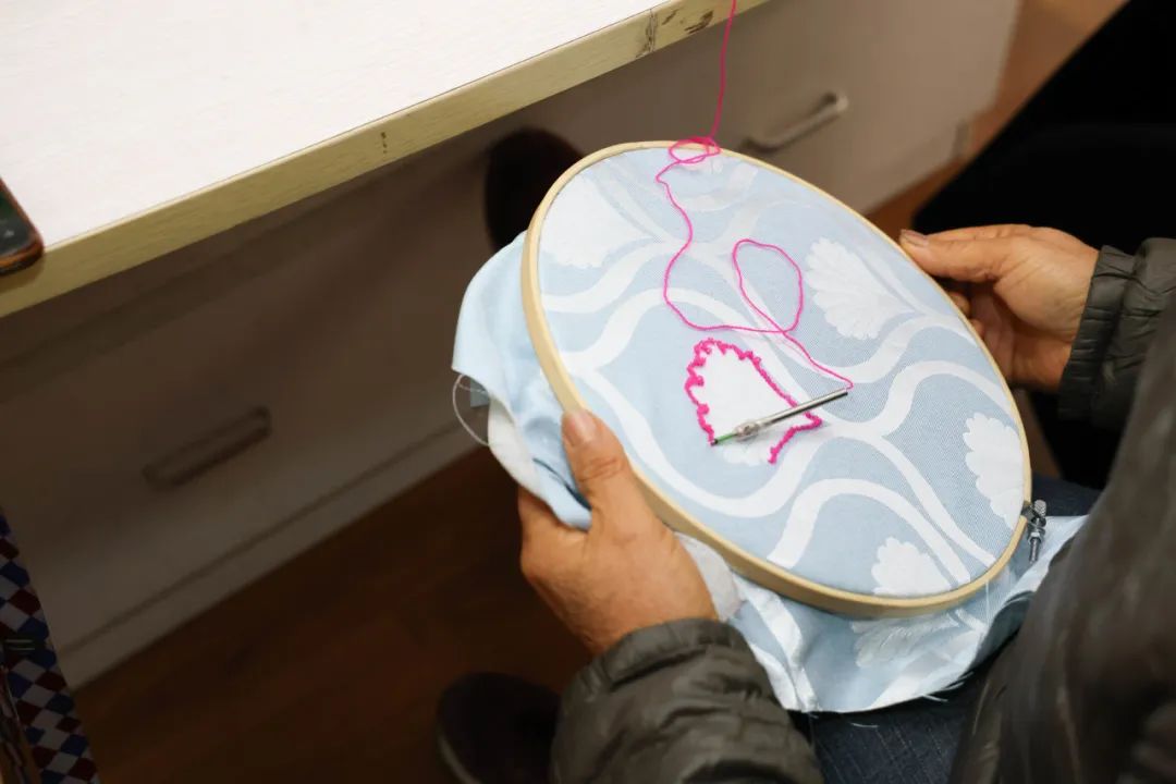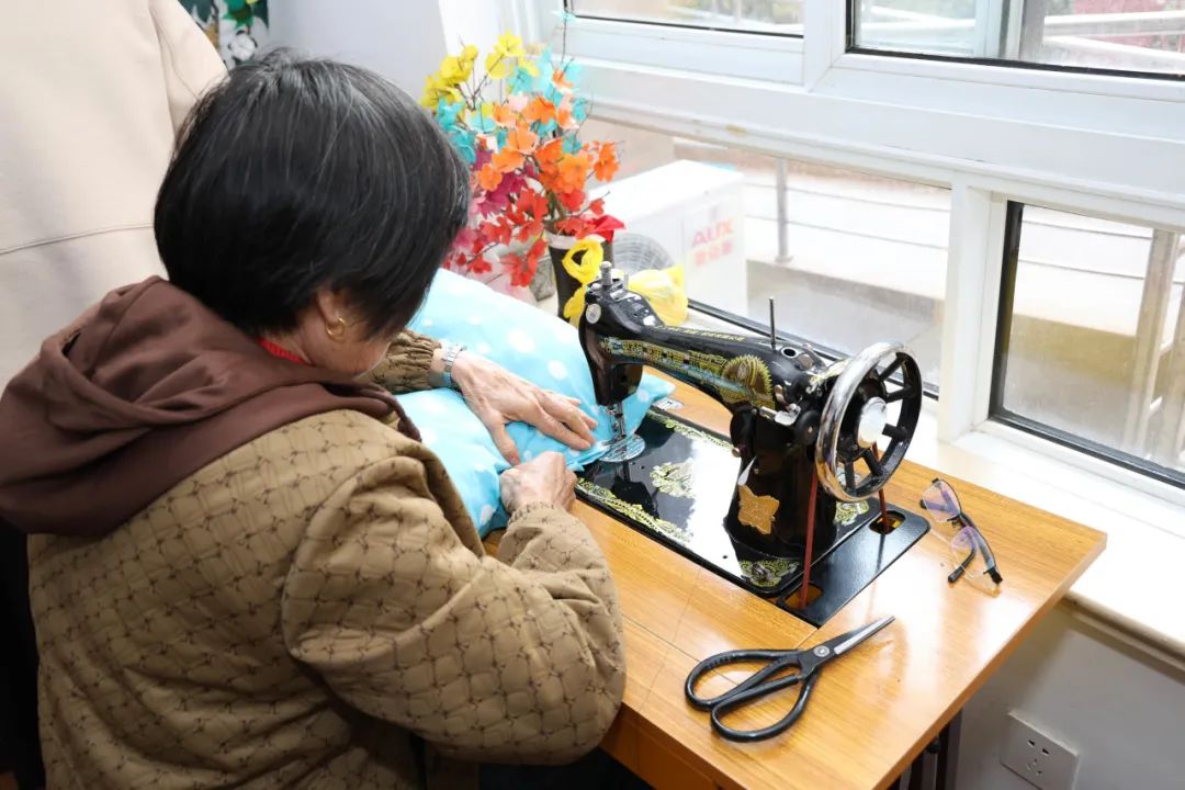 而另一间里,缝纫机也在抓紧工作着,阿姨不仅要把垫子缝合,还要把绣花缝上去,活动室里仿佛一条顺畅的流水线,每个阿姨都有着自己的分工。