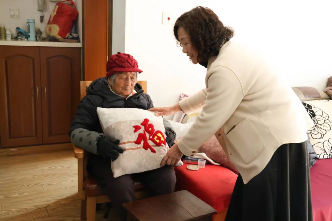 制作完的靠垫也要及时送到老人手里,今年88岁的李奶奶每到冬天,最喜欢的事情就是推着轮椅坐在暖和的阳光下,因此巧手队制作的靠垫可谓是“及时雨”。李奶奶说:”棉鞋、袜子、围巾,每年都有的,太好了!这样一靠舒服,而且天冷靠着暖和,或者放身上、膝盖上也好的。“