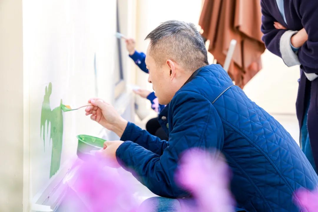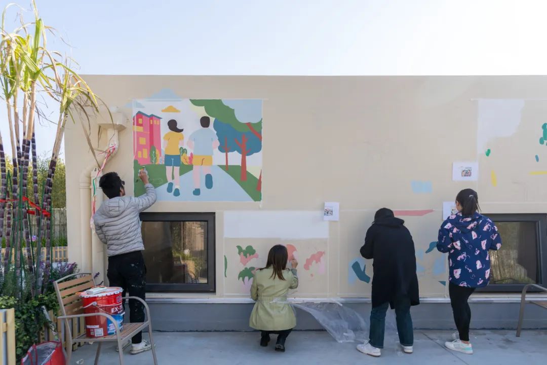 另一侧的墙面上,人们在上音绿地跑步、在罗密欧阳台演奏小提琴、在武康大楼二楼花园平台协商议事、在陕西南路188弄花园打理花草、在新就业群体之家一起包汤圆……大家用画笔定格下了这一个个五彩缤纷的瞬间。