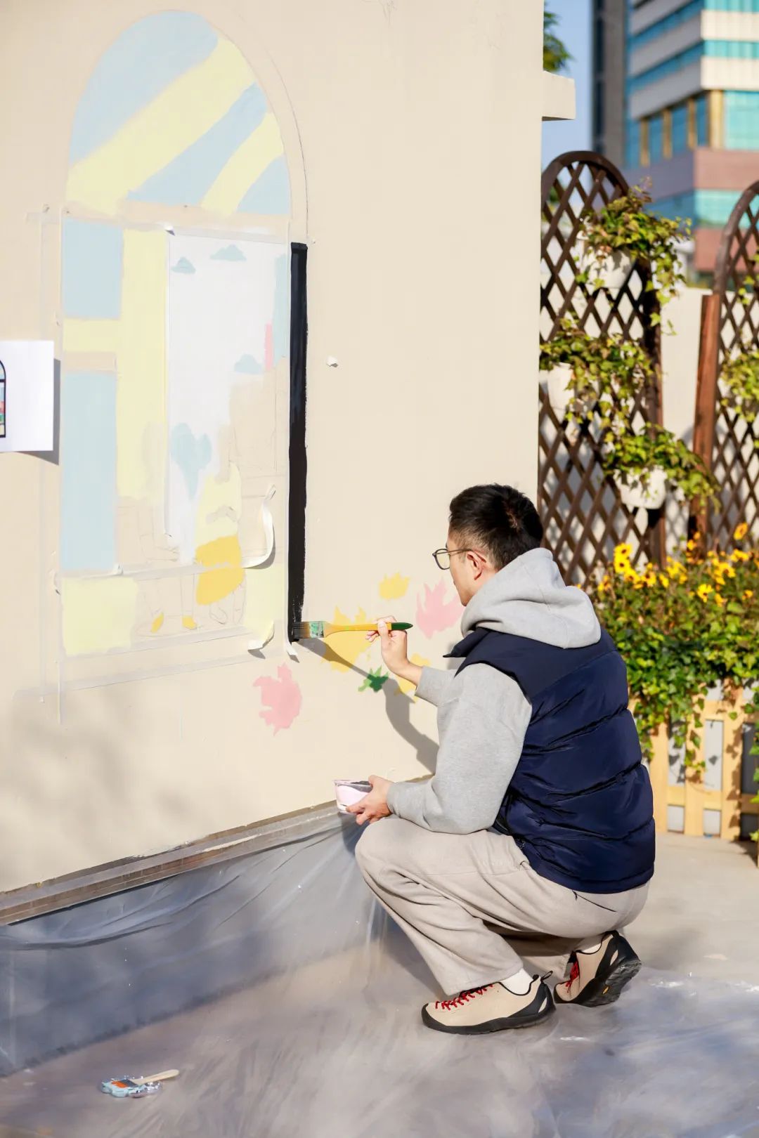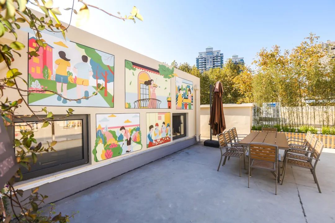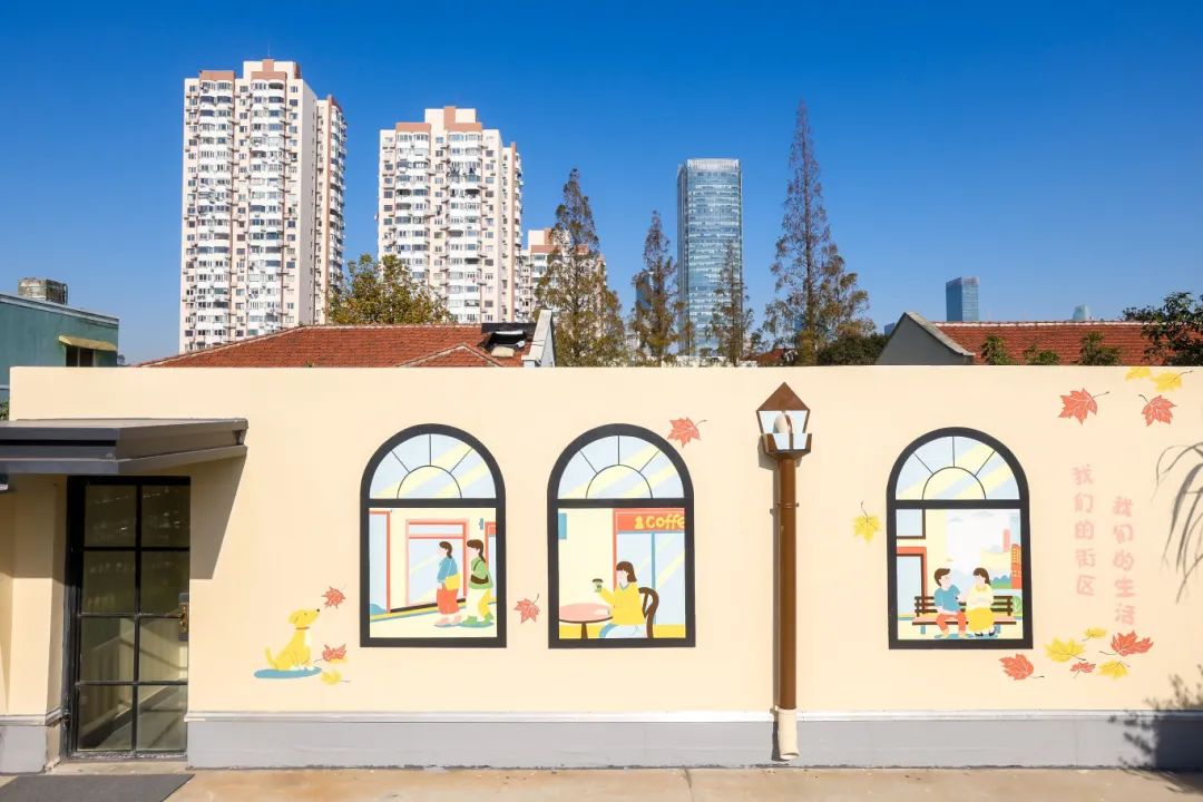 武康安福风貌街区的图景被定格在了墙上!经过4天的绘制,徐汇区湖南街道党群服务中心·复8邻里汇3楼的空中花园焕然一新,一幅幅色彩斑斓的画作与周围的绿植相映成趣,甚至连原本突兀的落水管都成了一盏“路灯”。