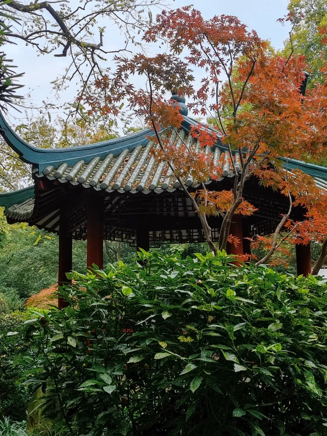 眼下的中山公园真的“红”。四角亭与六角亭旁,枫叶如火如荼,红得热烈而深邃,仿佛是大自然精心布置的调色盘,每一抹色彩都恰到好处。人们或站在亭中远眺,或倚靠在栏杆旁,静静观赏这份季节的馈赠。不少市民已经连续多年在此打卡,他们说,每一次来,都能发现不同的美。