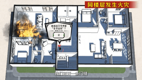 如果开门走廊里没有烟,但是楼梯间里有烟,仍然要退回室内关门等待救援;