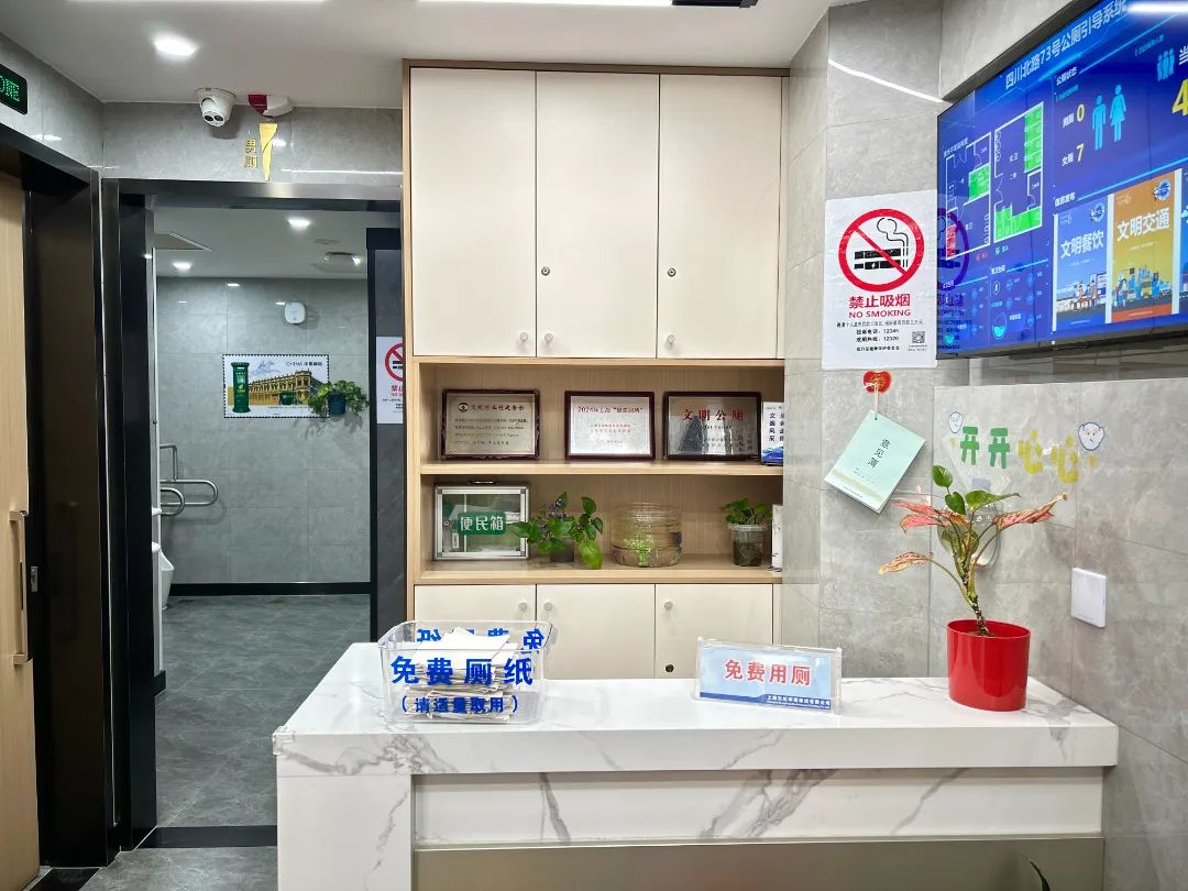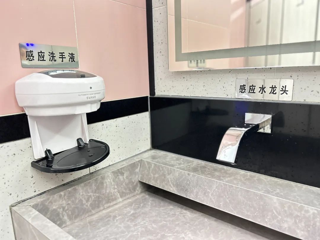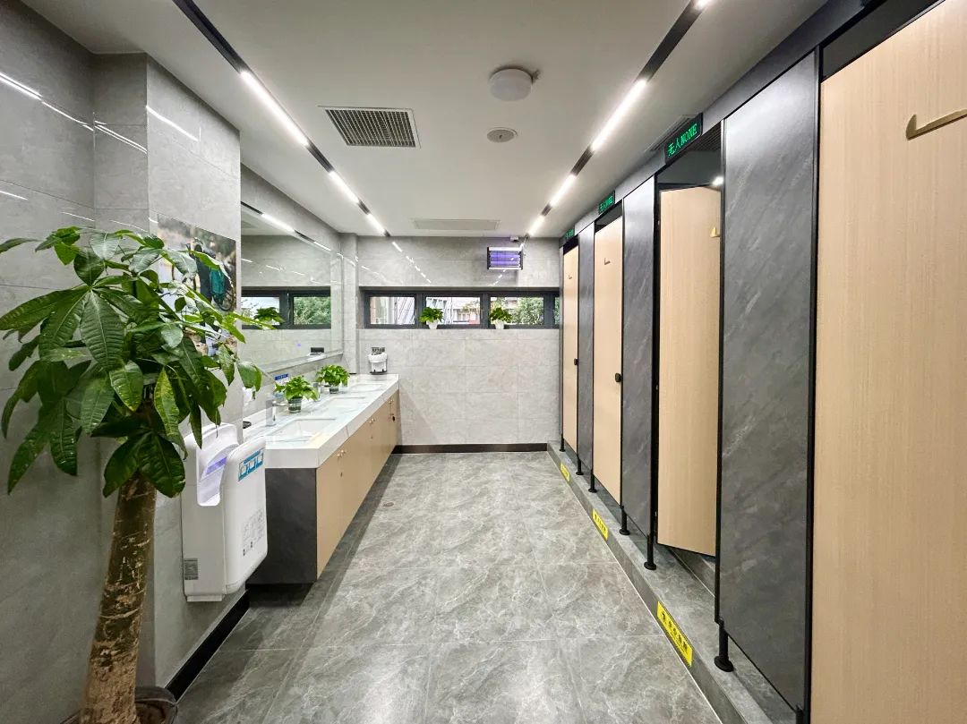 公厕还安装了节能节水装置、新风系统以及智慧显示屏等高科技设备,还设有便民箱、雨伞存放架和免费厕纸等便民设施,洗手区配备热水洗手设备、触摸按键镜子、红外感应水龙头等细节设计,让如厕体验更加清爽、舒适、便捷。