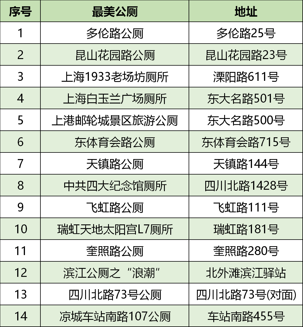 自2018年本市开展“最美厕所”评选活动以来,虹口区已有14座公厕入选(详见以下目录)。
