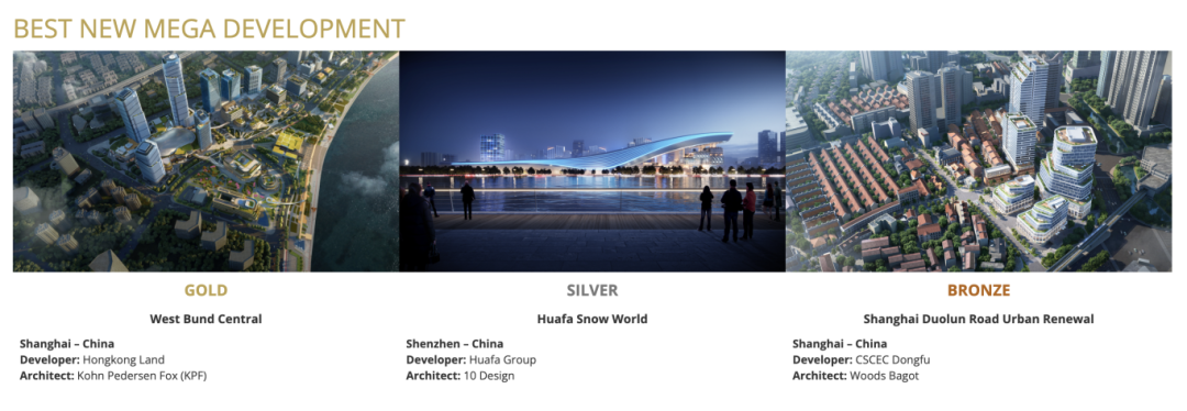 MIPIM Asia Awards设立于2007年,每年举办一次,致力于表彰亚太地区最优秀的房地产项目,是亚太地区房地产行业的“奥斯卡”。最佳未来大型项目类别旨在表彰正在进行中或即将开始建设的开发项目,这些项目通过其独特的建筑、技术和环境特质,全面承诺实现可持续的城市建设。