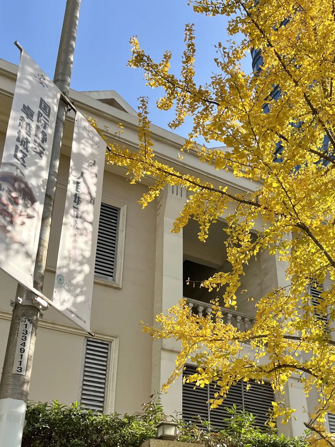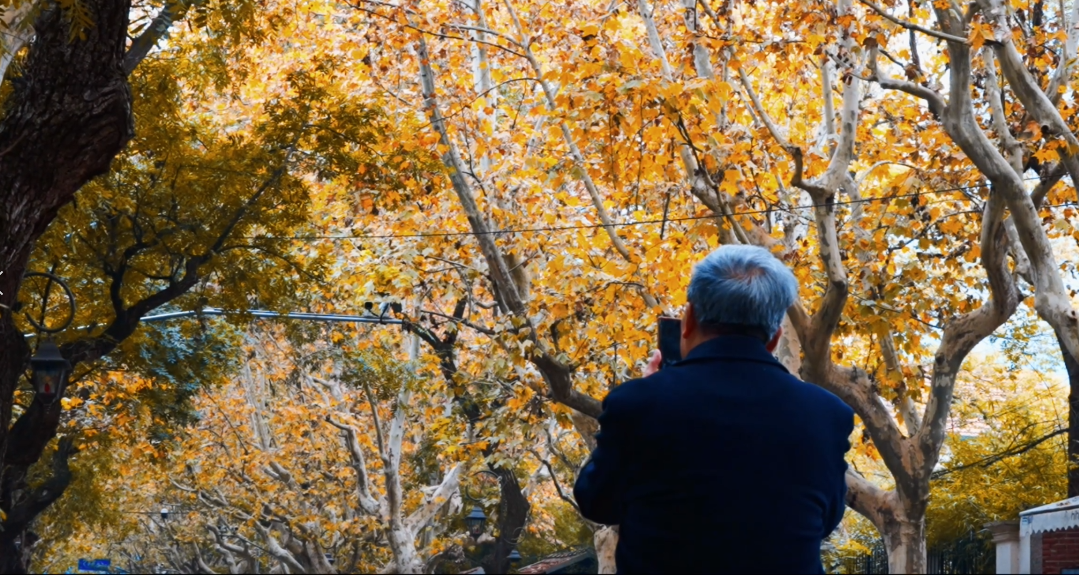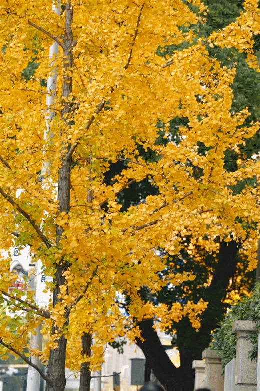 常德路(延安中路—北京西路)的130余株银杏笔挺地立在道路两旁,用纯粹的金黄笔触,勾勒出城市的轮廓。微风拂动,黄金色的叶片簌簌而落,似蝴蝶翩跹。